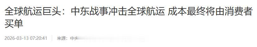 《全球航运巨头:中东战事冲击全球航运 成本最终将由消费者买单》央视新闻2026-03-13