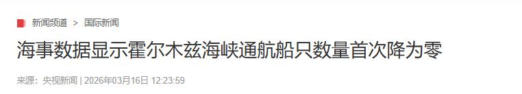 参考资料:《海事数据显示霍尔木兹海峡通航船只数量首次降为零》央视新闻2026-03-16