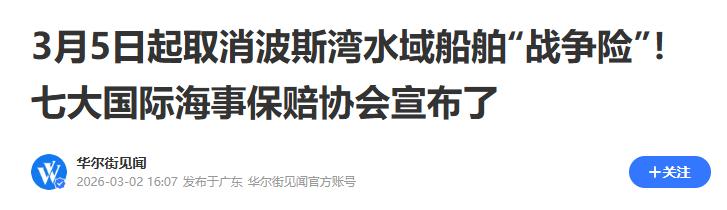 《3月5日起取消波斯湾水域船舶“战争险”!七大国际海事保赔协会宣布了》华尔街见闻2026-03-02