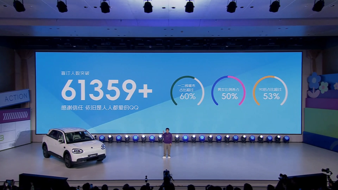 此次全新 QQ3 的焕新发布,是奇瑞 QQ 系列在电动化时代的全面升级。据发布会披露信息,新车盲订开启仅一个月便收获 61359 份订单,其中一二线城市用户占比超 60%,95 后年轻用户占比达 53%,男女用户比例均衡,延续了初代 QQ 产品跨越年龄、地域与消费圈层的普适性。