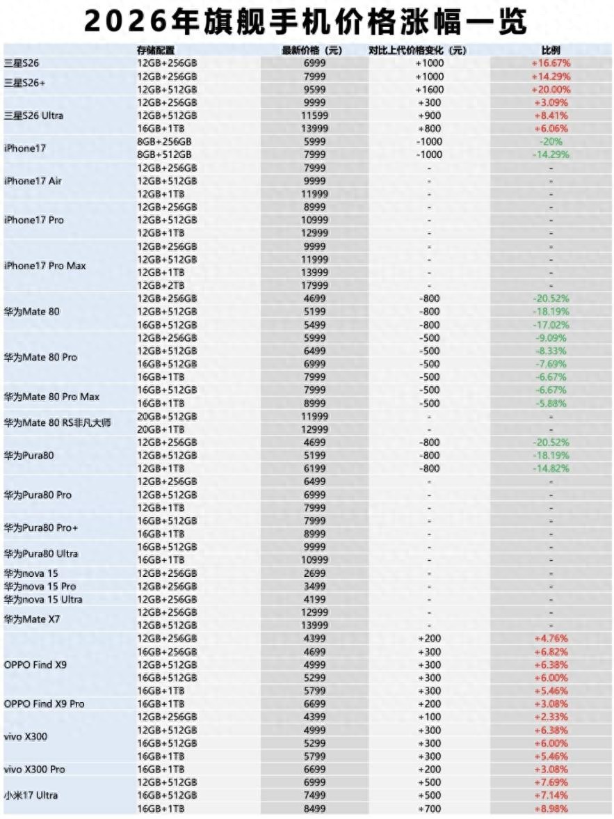 智能手机市场正遭遇近五年来最猛烈的供应链冲击。受AI产业对高规格存储芯片产能的大规模挤压,存储芯片现货价格在过去三个月内累计飙升超过300%。内存大涨带动手机全行业涨价,不少品牌新机更贵、老机也涨,消费者购机成本将明显上升。根据渠道调研显示,主流手机品牌,如OPPO、vivo、小米、荣耀等多家头部手机品牌已拟定于3月初启动新一轮产品价格调整。