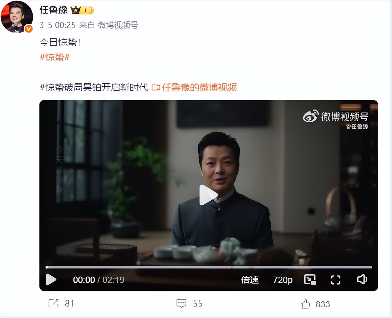 视频中的他穿着一身剪裁得体的灰色中山装,坐在茶桌前讲述着惊蛰的节气。