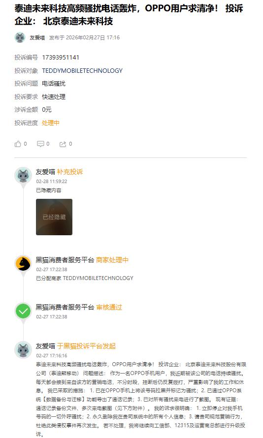 有用户投诉称:“最近十天左右频繁接到涉骗信息,最晚是晚上十二点多,严重影响我的生活”还有用户投诉称:“泰迪熊移动提供催收电话,爆我的通讯录给我的同事及亲友发骚扰短信,使我无法正常工作生活”,另一位用户详细描述维权经历:“我近期被该公司的电话持续骚扰。每天都会接到来自该方的营销电话,不分时段,挂断后仍反复拨打,严重影响了我的工作和休息。”该用户要求泰迪熊移动“1. 立即停止对我手机号码的一切外呼骚扰;2. 永久删除我在贵司系统中的所有个人信息;3. 请贵司规范营销行为,杜绝此类侵权事件再次发生。 若不处理,我将继续向工信部、12315及运营商总部进行升级投。”