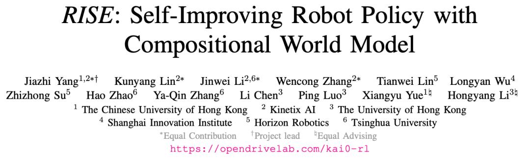 香港大学李弘扬老师带领的 OpenDriveLab 团队近期提出的(RISE(χ0-RL))(Reinforcement learning via Imagination for SElf-improving robots),给出的核心答案是: