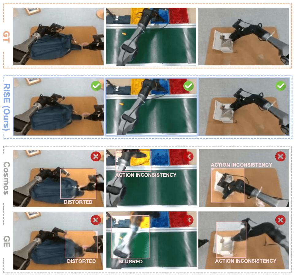 在模型生成质量的定量与定性评估中,RISE 的动力学模型表现远超 Genie Envisioner、Cosmos 等基线模型: