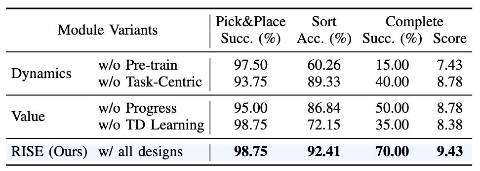 消融实验充分证明了 RISE 各模块设计的必要性,任何一个组件的缺失,都会导致性能的显著下降: