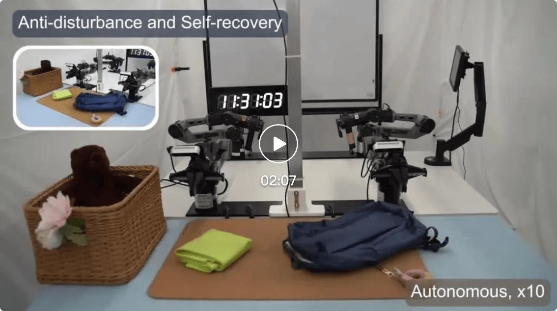 抗干扰:面对人为干扰带来的意外状态(如物体被推离原位、抓取滑落),模型能主动调整动作,从失败中恢复并完成任务;