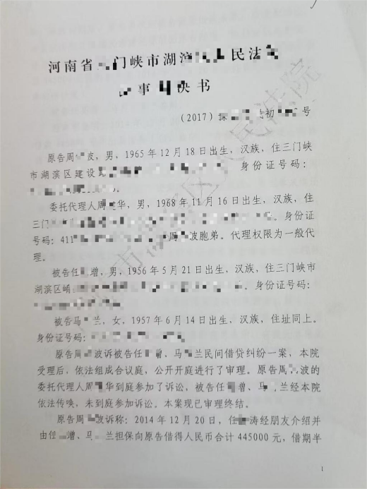 这起借贷案的诉讼过程,任老先生认为全程充斥着疑点和被人操控的痕迹。2015年,周某波首次起诉任某涛、张某春、任老先生、马某兰要求还款,因马某兰等人涉嫌非法吸收公众存款被立案侦查,湖滨区法院以案件涉罪为由裁定驳回起诉。