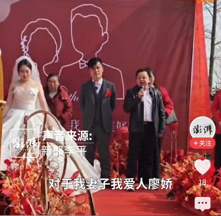 视频显示,婚礼正在举行,新娘父亲当场退还女婿彩礼,并表示希望“所有年轻人不要被金钱蒙蔽了自己的婚姻”。他收下100元,说“意思到了就行”,希望小两口能够好好创业,经营好自己的家庭。