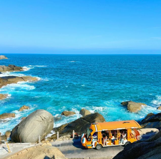 岛上的景观规划充分尊重了原有的地形地貌。西北部的沙滩沙质洁白细腻,被称为“玉带滩”,适合漫步与休憩 。著名的“情人桥”原为一座铁索桥,后改建为木板桥,延伸入海,是眺望海景的平台 。岛的东南悬崖处设“观日岩”,是一处俯瞰南海辽阔海域、感受山海气象的制高点,岩下有一巨石形似巨龟探海,自然形态惟妙惟肖 。由于地形原因,岛南部和东部的部分区域需要通过电瓶车游览,沿途可见嶙峋怪石与茂密的原始丛林 。无论是登高望远、漫步沙滩,还是探寻海底的静谧,这座海岛展现的是一幅自然生态与海岛地貌交织的画卷。