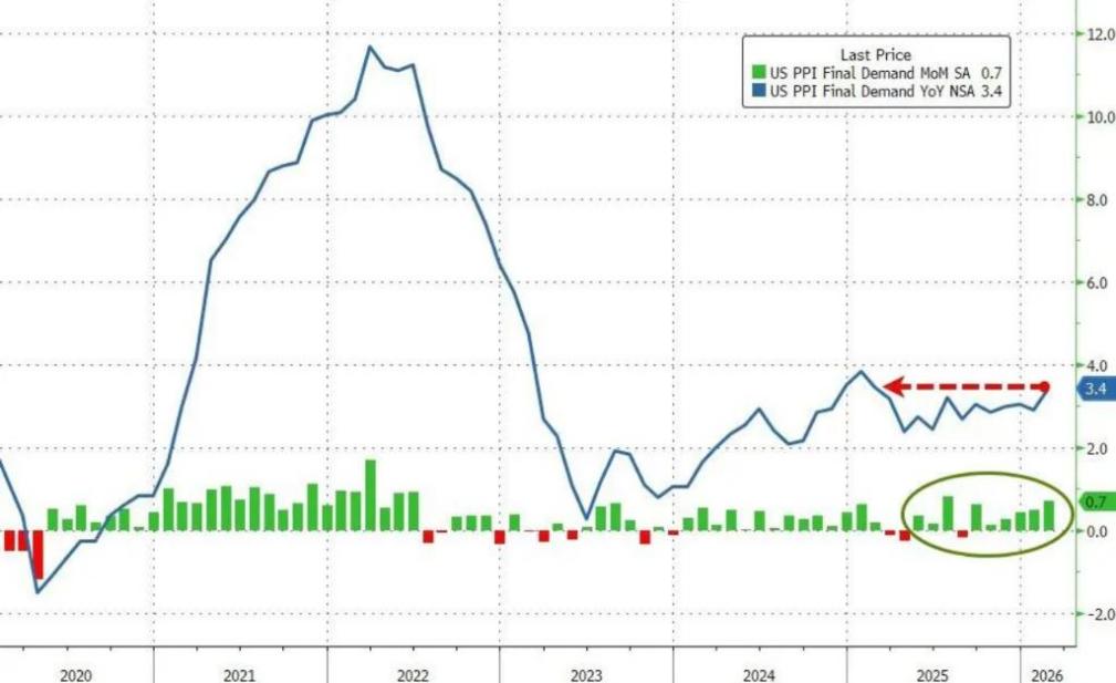 美国劳工部周三公布的数据显示,2月份批发通胀升至一年来最高水平,这进一步表明,在伊朗战争爆发之前,通胀压力就已顽固存在。数据显示,美国2月生产者价格指数(PPI)环比上涨0.7%,预期值为0.3%,前值为0.5%;同比涨幅达到3.4%,创下一年来新高,预期值为2.9%。