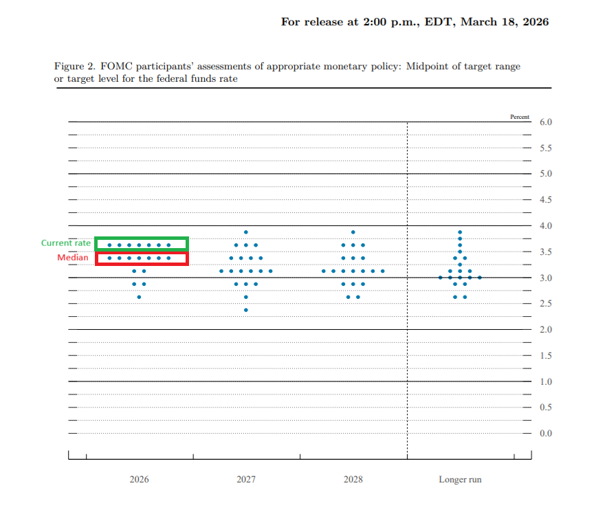 FOMC声明显示,委员们以11-1的投票比例通过此次的利率决定。委员会对经济前景的表述变化不大,但略微上调了2026年全年经济增长和通胀预期。尽管不确定性依然较高,官员们再次表示,未来仍可能进行数次降息。备受关注的“点阵图”显示,委员们普遍预计今年将降息一次,并在2027年再降息一次,但具体时点仍不明确。