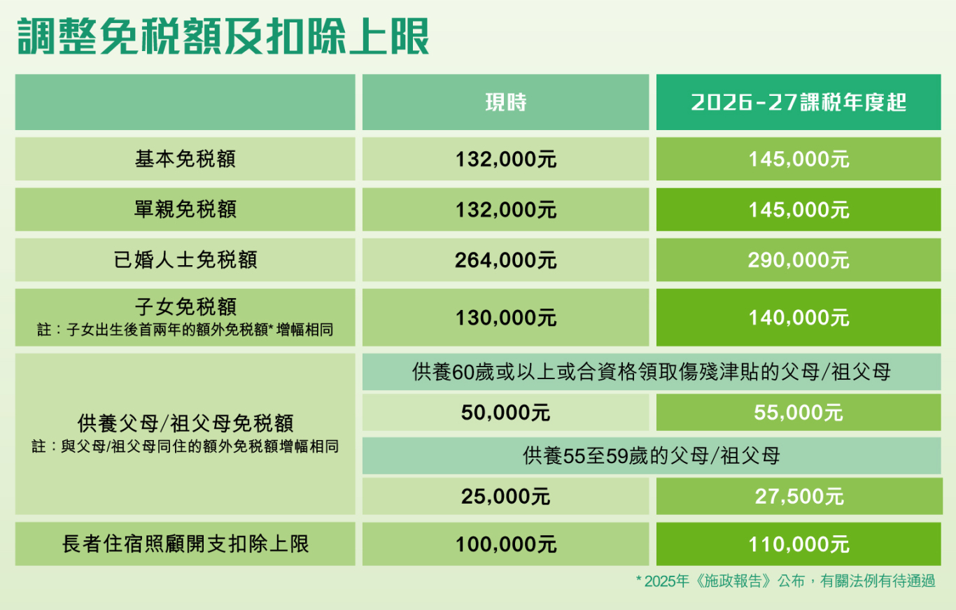 自2026/27课税年度起,将调升多项免税额: