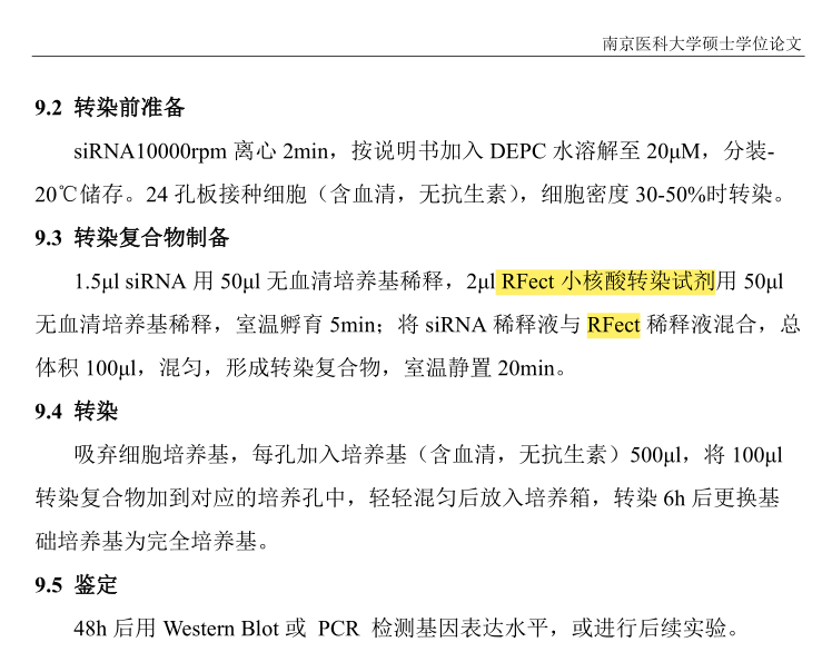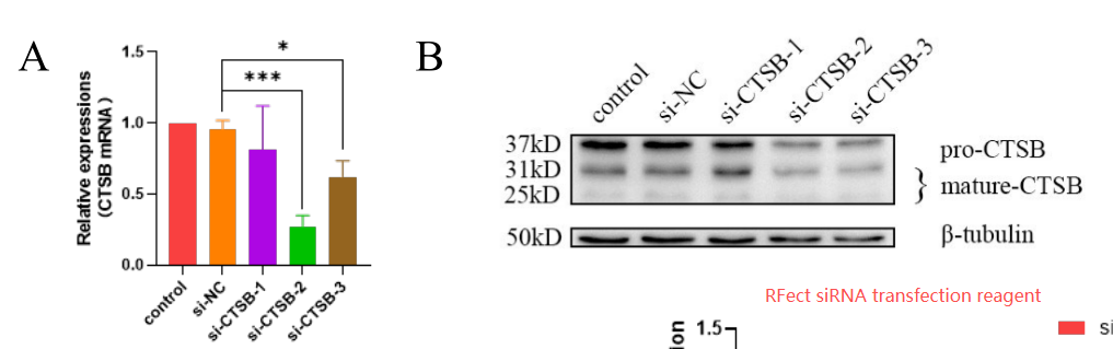南京医科大学研究者在CTSB调控小胶质细胞活化促进DR血管生成的作用研究中,为了研究敲低CTSB对高糖处理的BV2细胞形态、增殖、迁移、炎症因子表达以及促血管生成能力的影响,使用RFectsiRNA转染试剂将siRNA-CTSB转染进入小鼠小胶质细胞BV2中,经RT-qPCR和WB检测发现,siRNA处理后BV2细胞的CTSB mRNA表达水平和蛋白水平均显著降低,其中mRNA表达水平相比于对照组敲降效率达75%左右!
