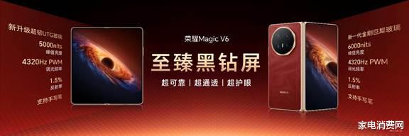 荣耀Magic V折叠屏系列自诞生之日起,就在不断刷新折叠行业品类上限。此次荣耀Magic V6不仅在极致轻薄上持续引领,更首次将折叠屏电池容量带入7000+mAh时代,续航实力跨代领先。内外均采用荣耀自研至臻黑钻屏,国际顶级七大权威认证诠释顶级屏幕素质。全新荣耀盾构钢铰链和超强整机防尘防水,将可靠性拉满。同时,凭借满血性能和出色影像配置,以及全新AI生产力和跨生态互联体验,带来从内核到外观,从硬件到软件的“折叠屏大满贯”实力。