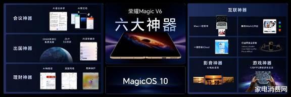 如果说硬件实力决定折叠屏的性能边界,那么AI和生态等软件能力则决定折叠屏的好用程度。此次荣耀Magic V6不仅在硬件创新上实现“全满贯”,在软件配置上也同样能打。荣耀Magic V6带来会议、理财、出国、影音、游戏、互联六大场景的“六大神器”软件体验。