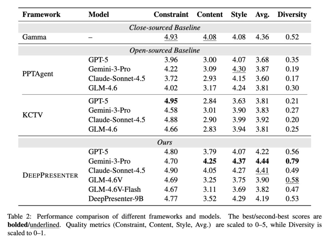 结果表明:DeepPresenter-9B 取得了 4.19 的高分,表现与闭源模型 GPT-5(4.22)几乎持平,并且 DeepPresenter 显著优于其他的幻灯片生成方案。