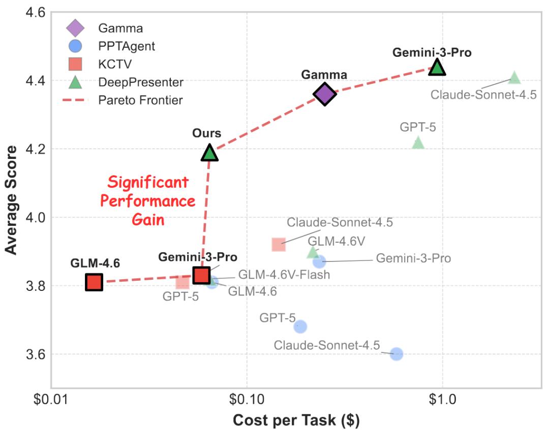 更值得关注的是,在成本 — 性能曲线中,DeepPresenter-9B 位于前沿的 “突变点” 位置,意味着在性能与价格之间达到了极具竞争力的平衡。