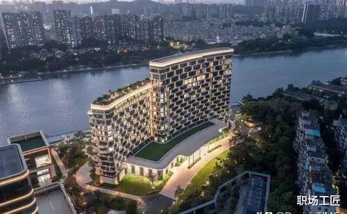 酒店楼体采用柔和弧形设计,恰如随水流波动的地貌曲线,呼应着珠三角特有的地理形态。这种非几何化的表达,让整片区域从工业冷峻感中挣脱,转化为一个更具人文温度的生态综合体。
