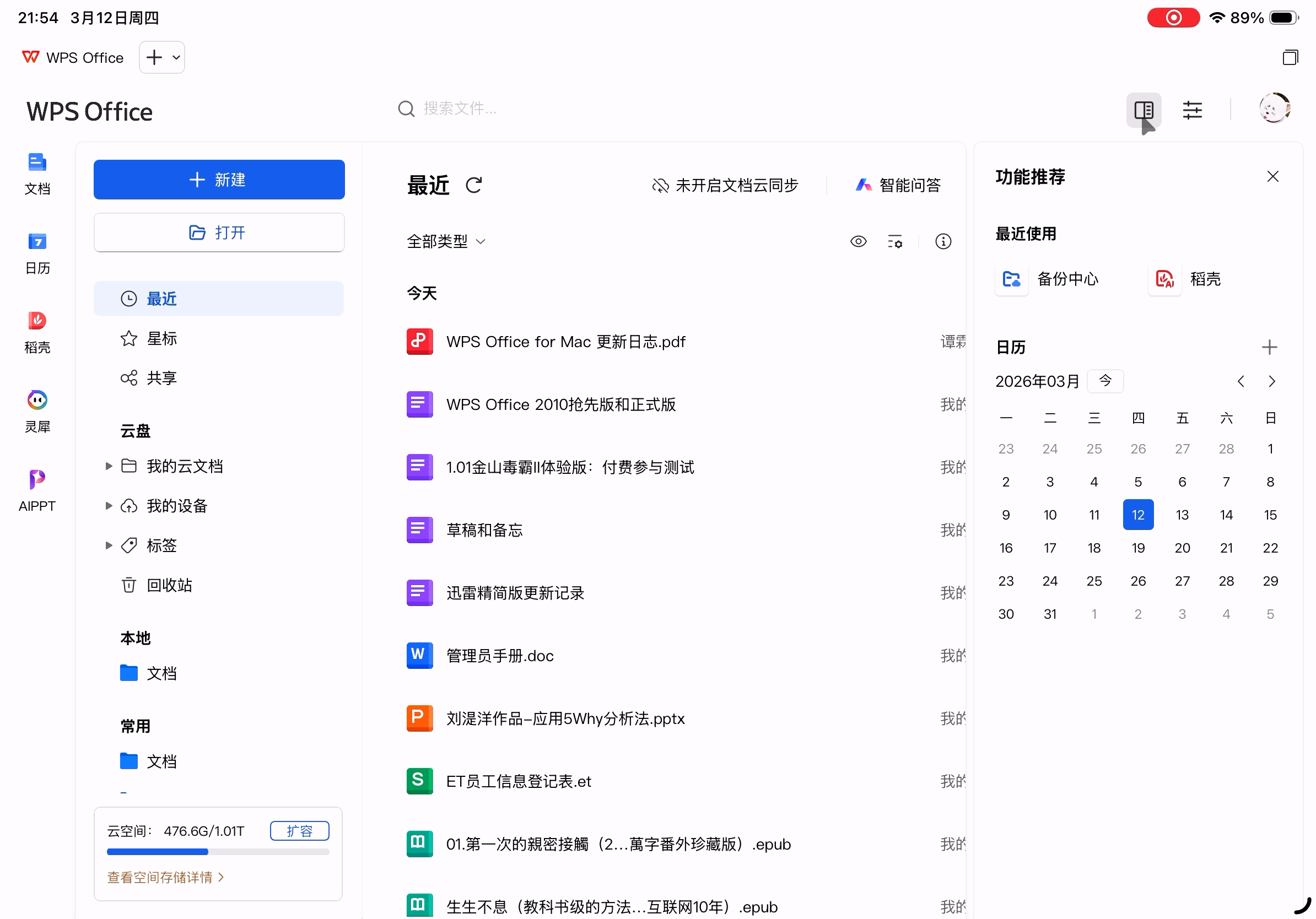 右侧面板是功能推荐和日历,可能是我刚开始用,功能推荐中只有“最近使用”。
