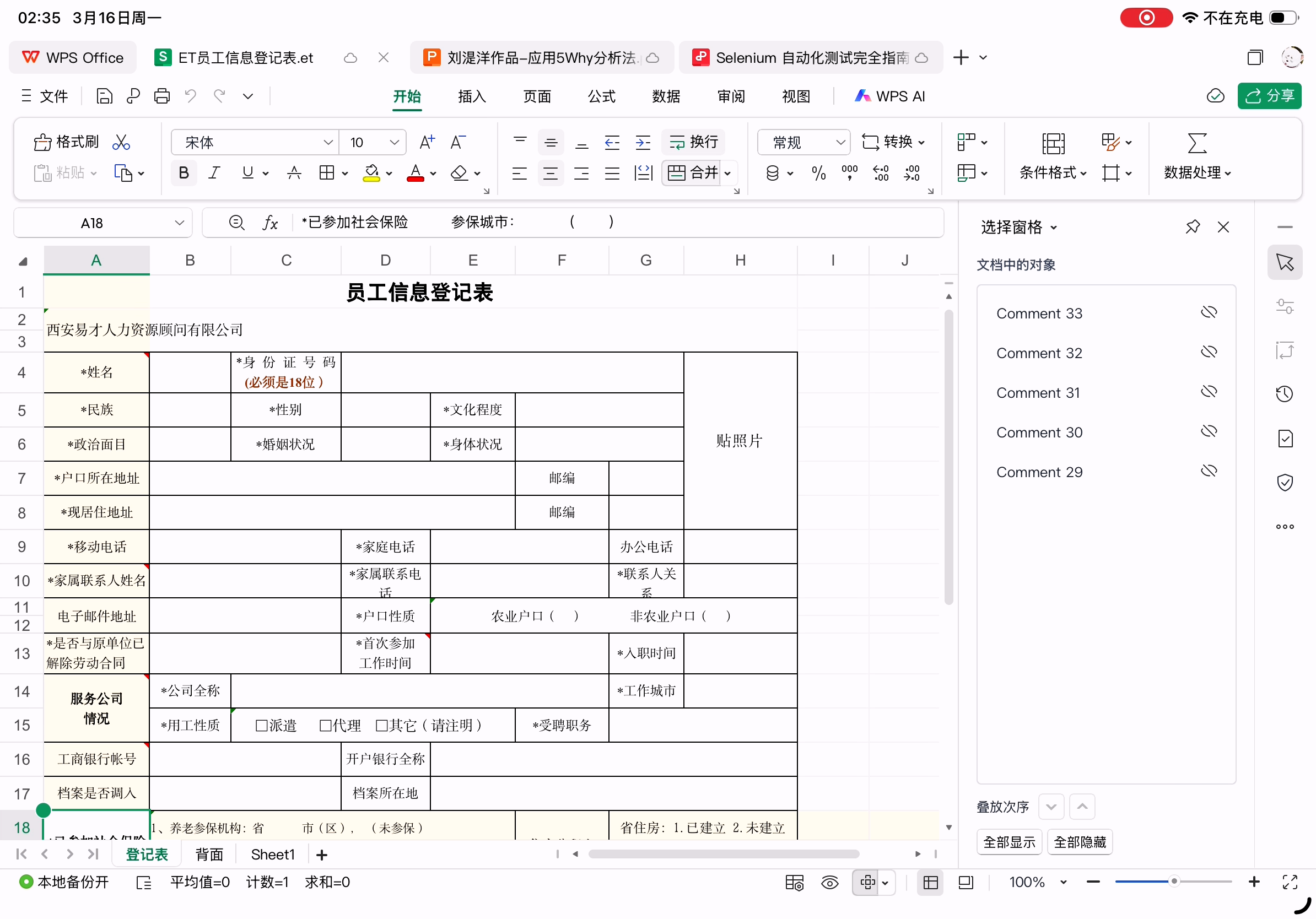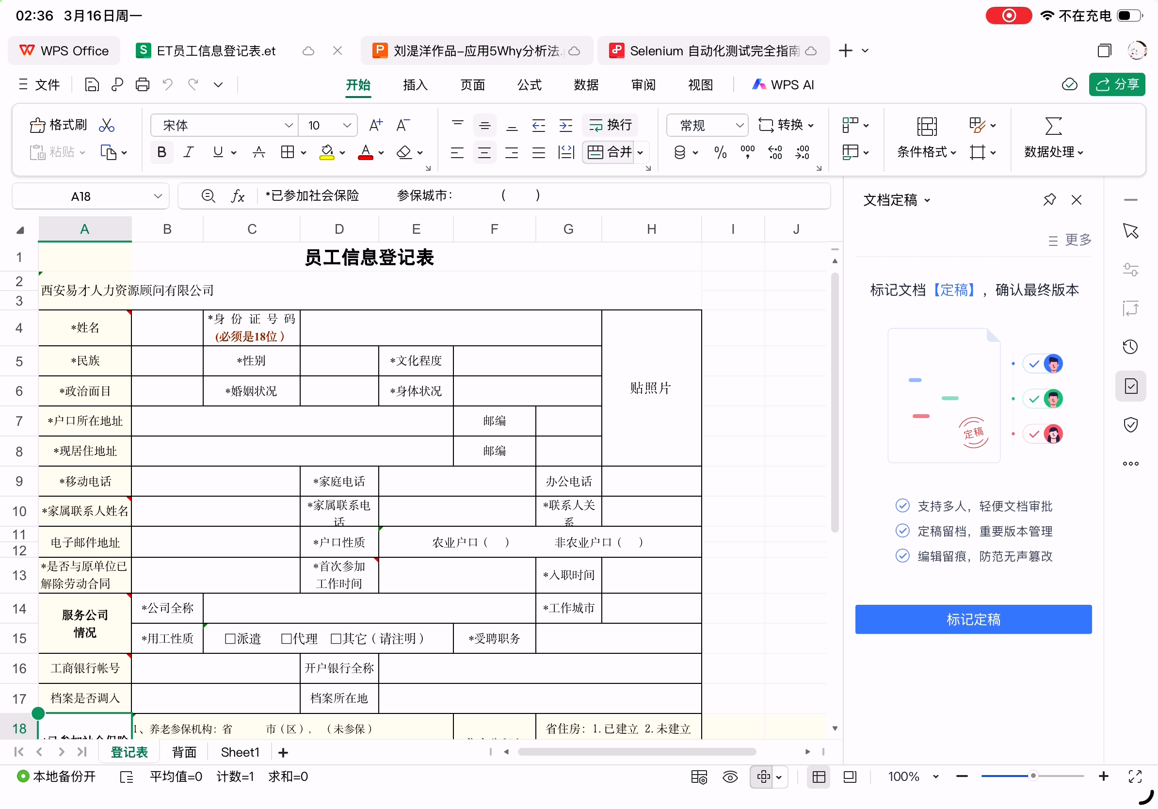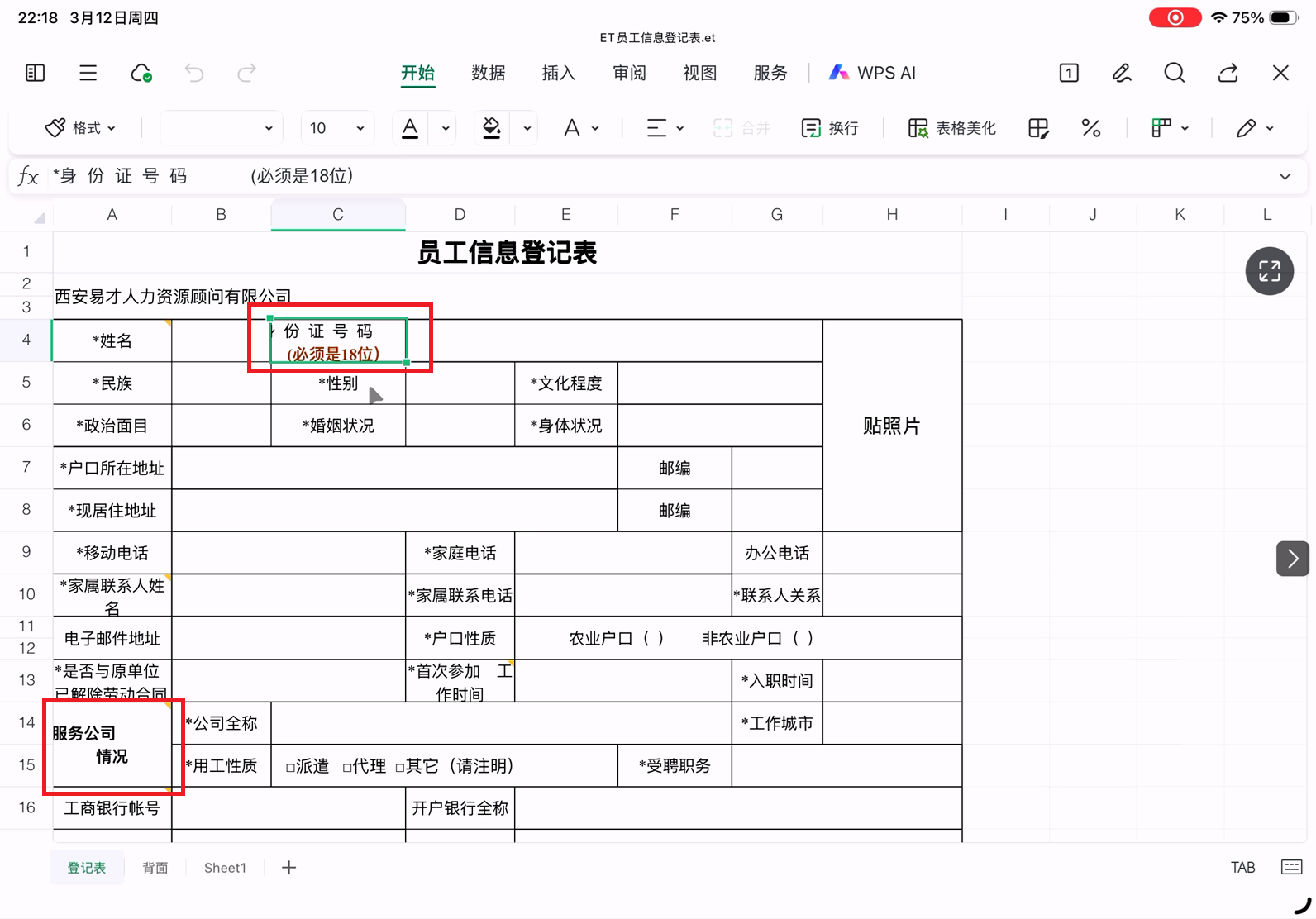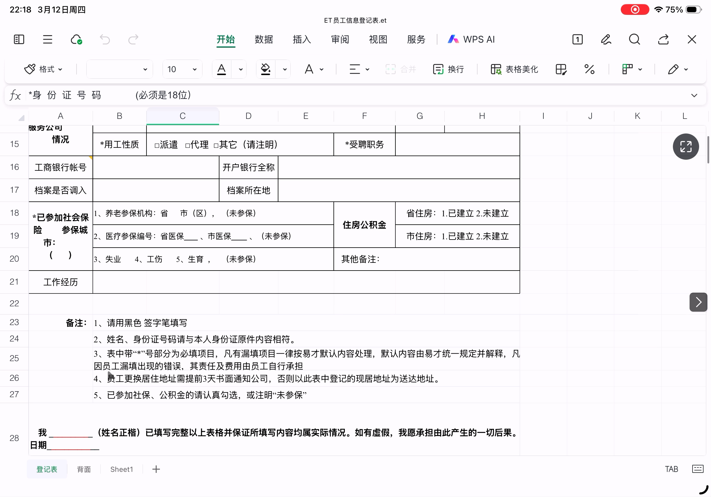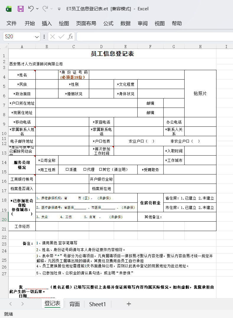 最容易出问题的员工信息登记表在Excel中的样子(et格式)。这个表格中手动换行的单元格都是通过空格实现的,所以不同字体、渲染出不同表格宽度和字体字号时会导致换行不正确。