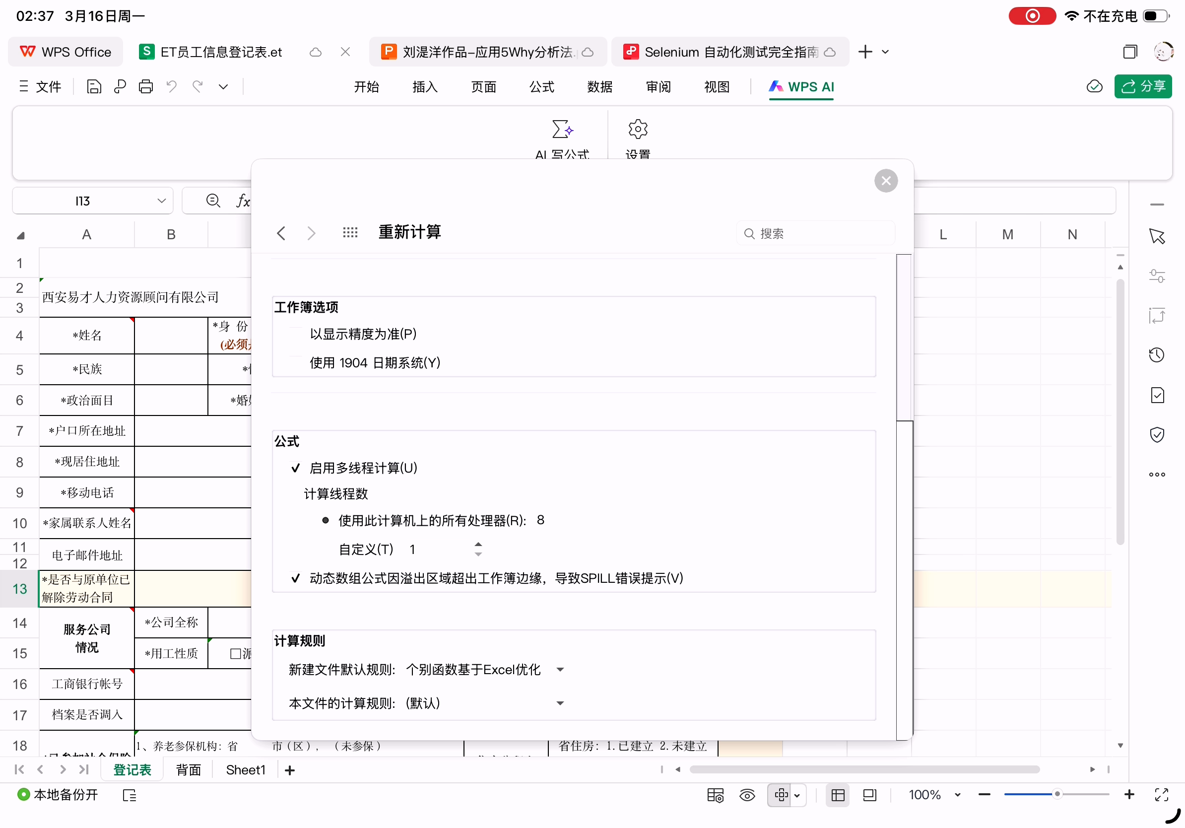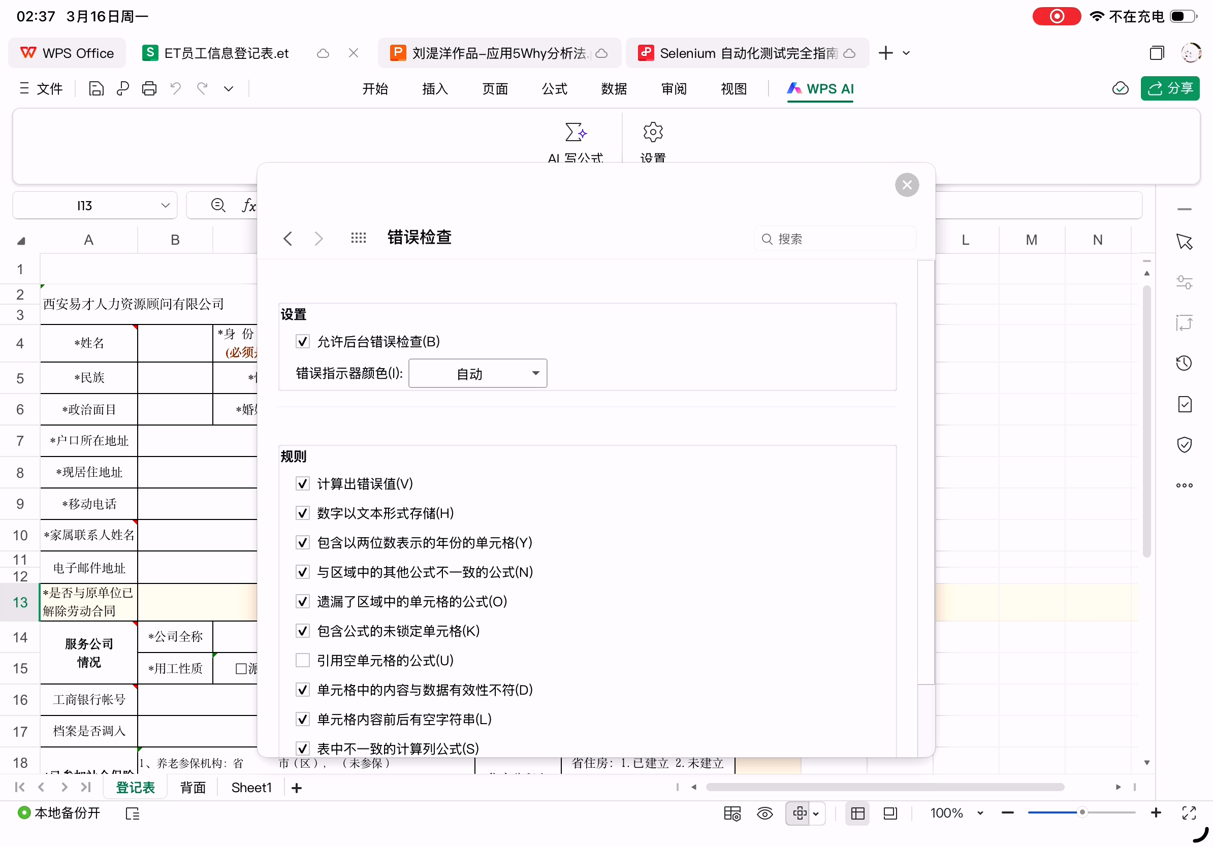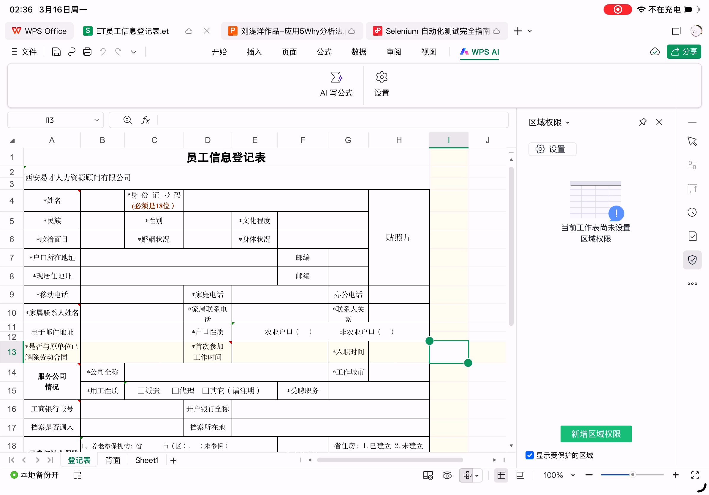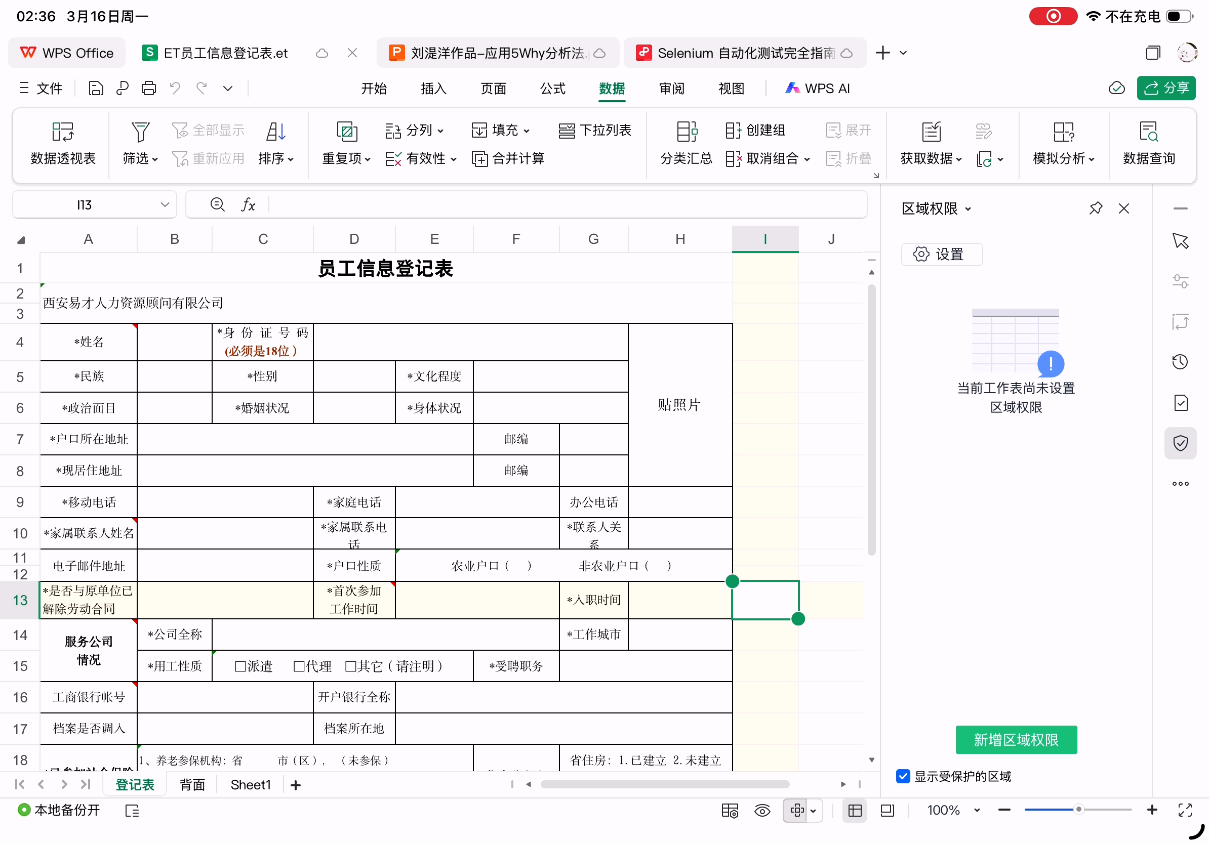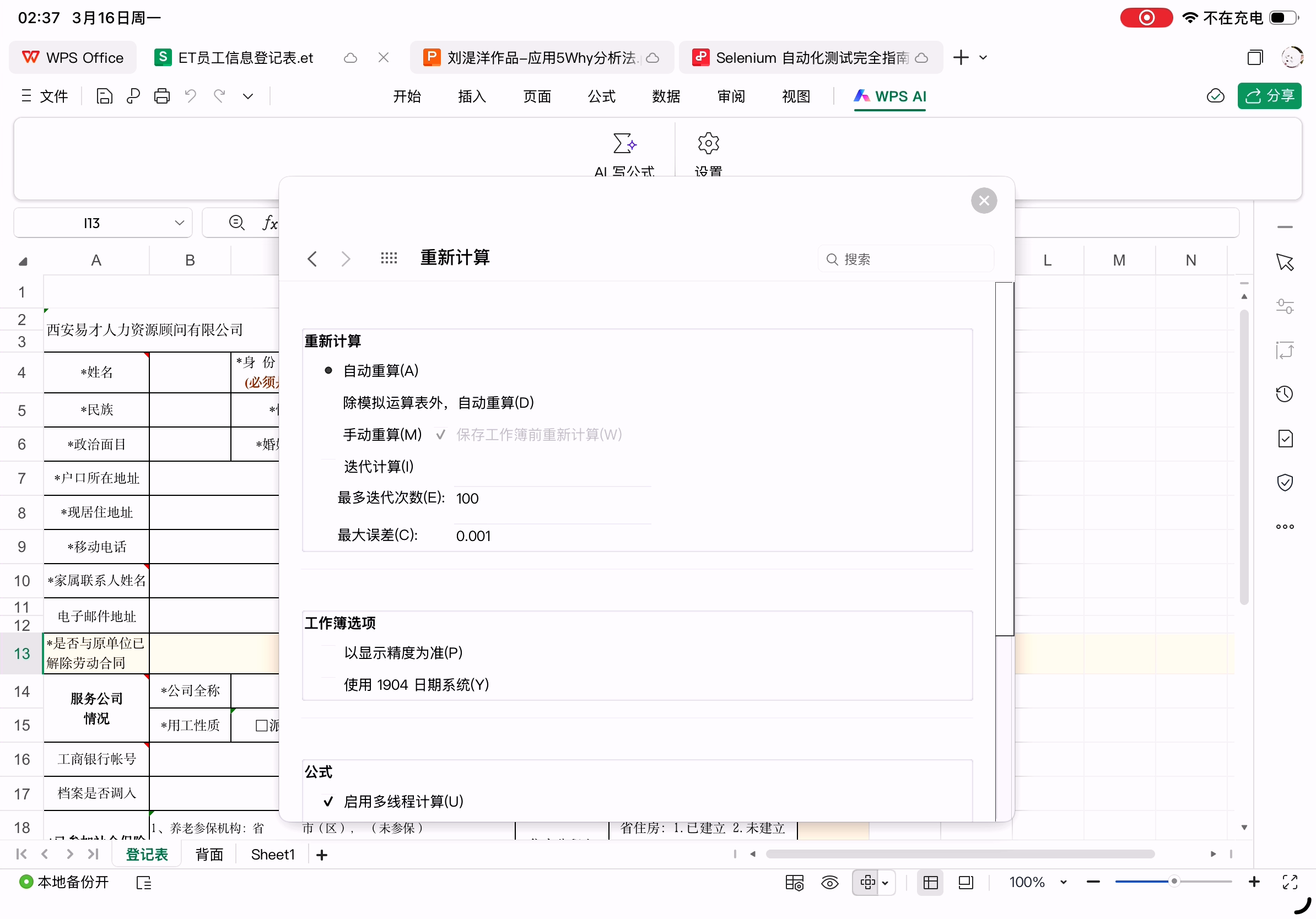 最容易出问题的员工信息登记表在Excel中的样子(et格式)。这个表格中手动换行的单元格都是通过空格实现的,所以不同字体、渲染出不同表格宽度和字体字号时会导致换行不正确。