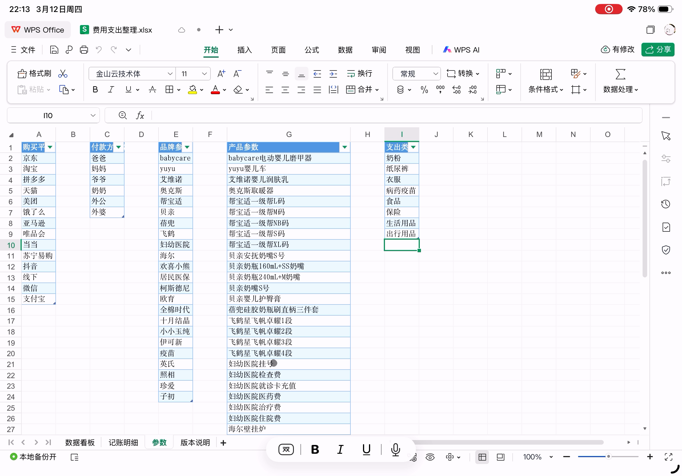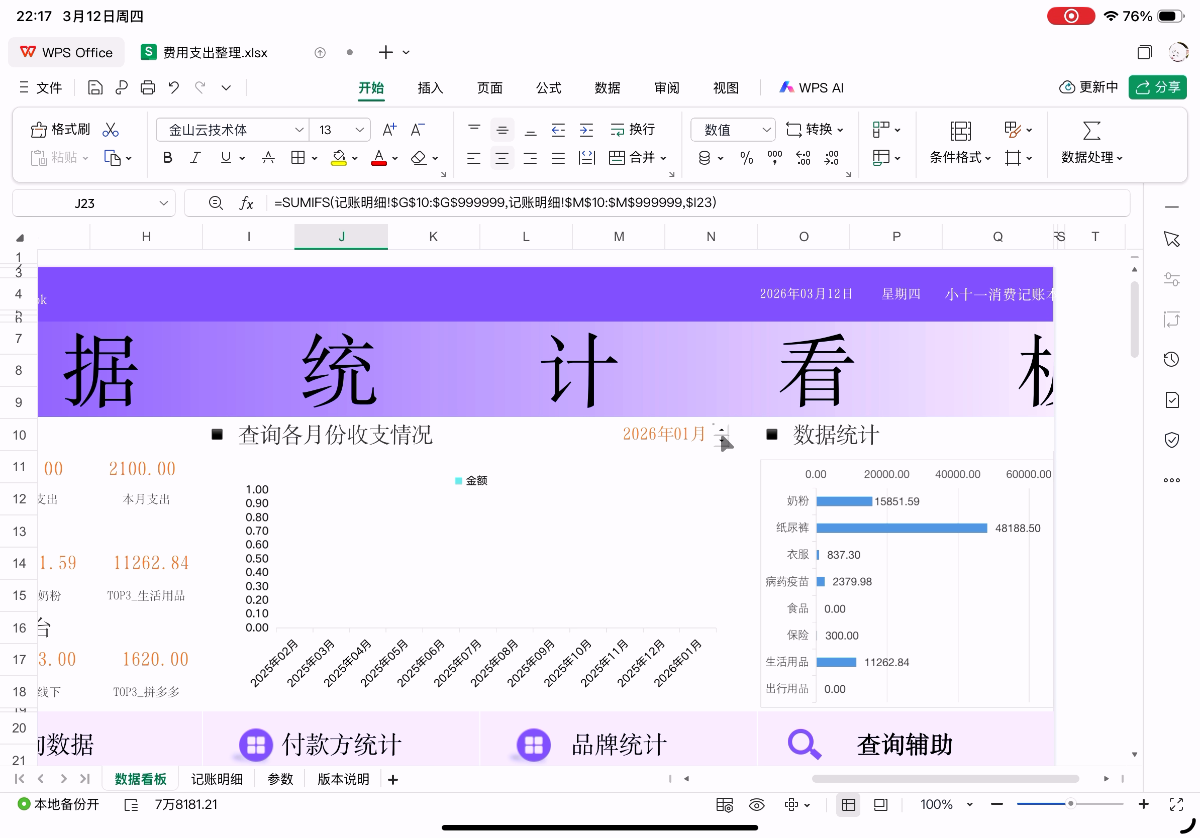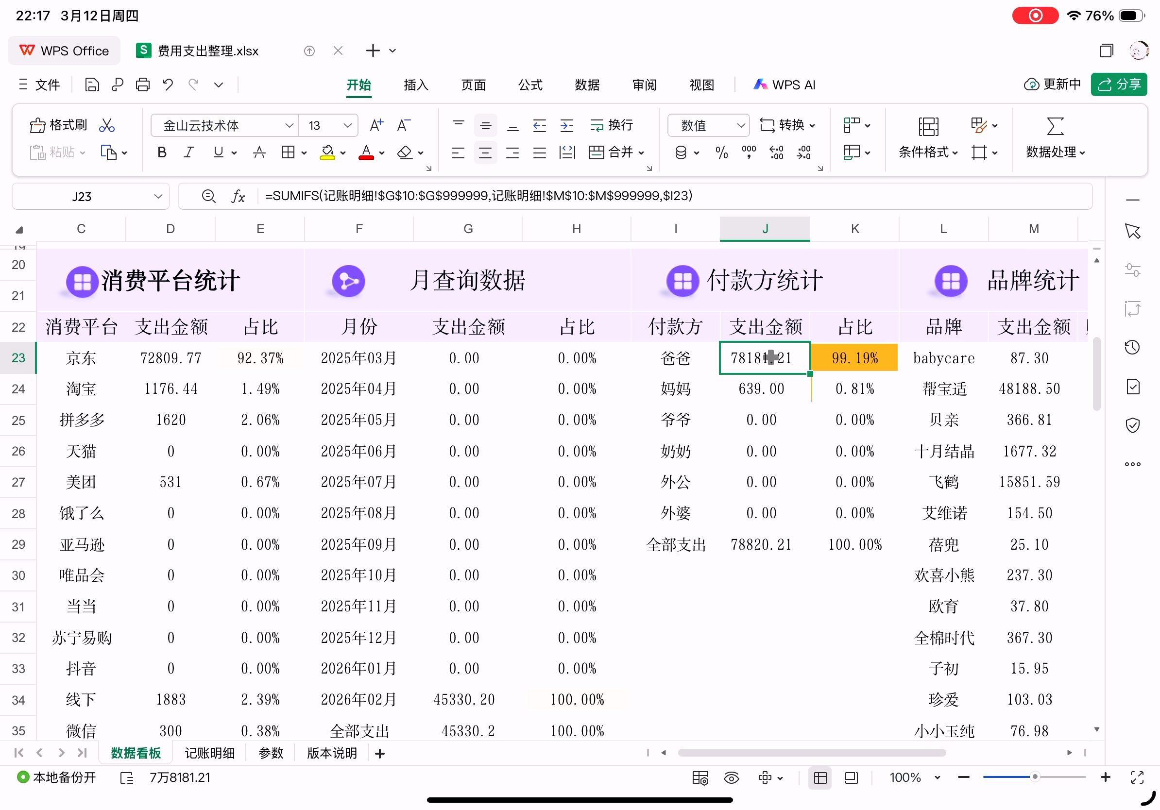 账本表格在PC上WPS中打开的样子,下图为已经在Pad上修改后的版本,数据统计正确。