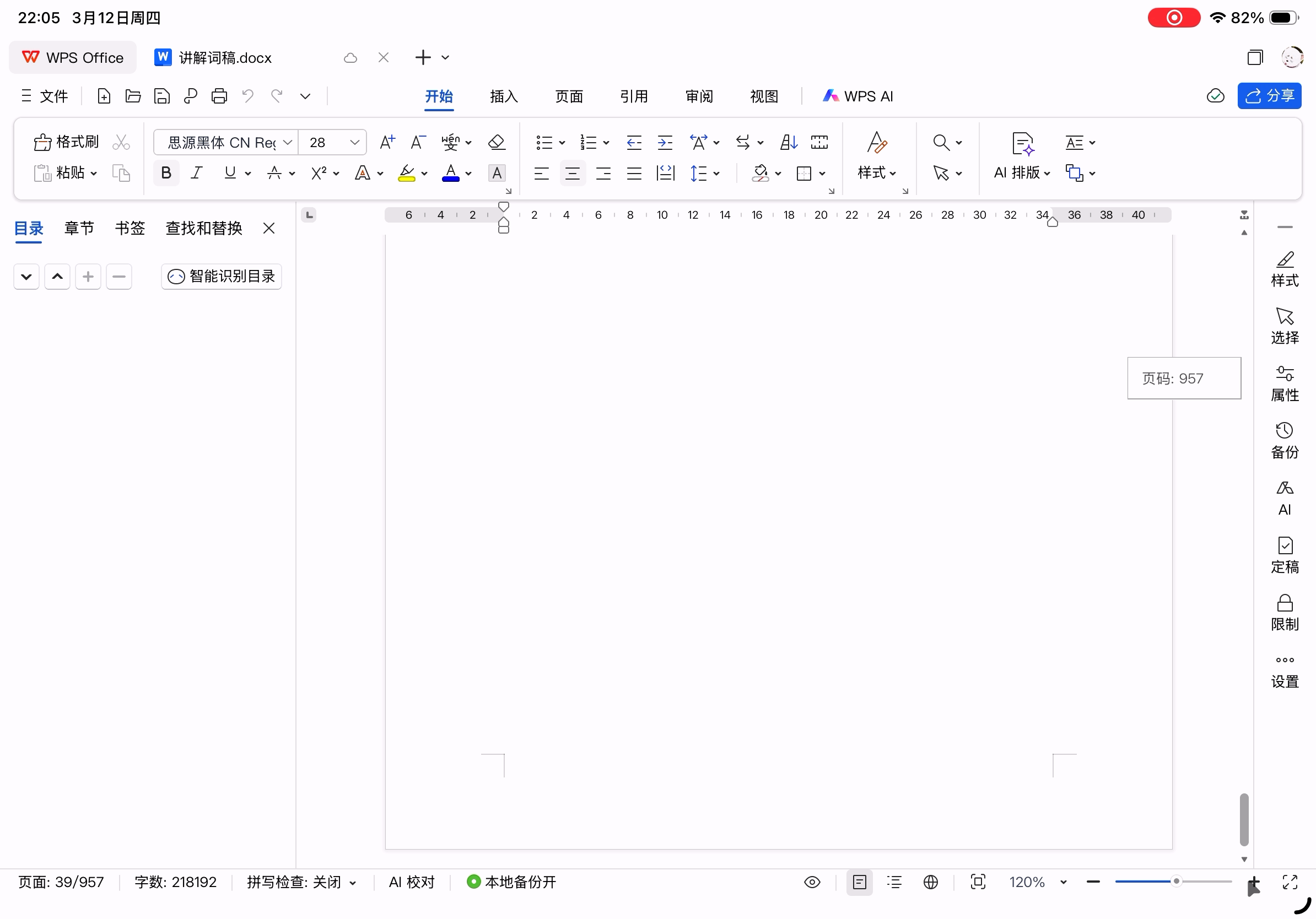 打开900多页、21万多字的百MB大docx文件,加载时有少许缓慢的感觉,但加载速度尚可。