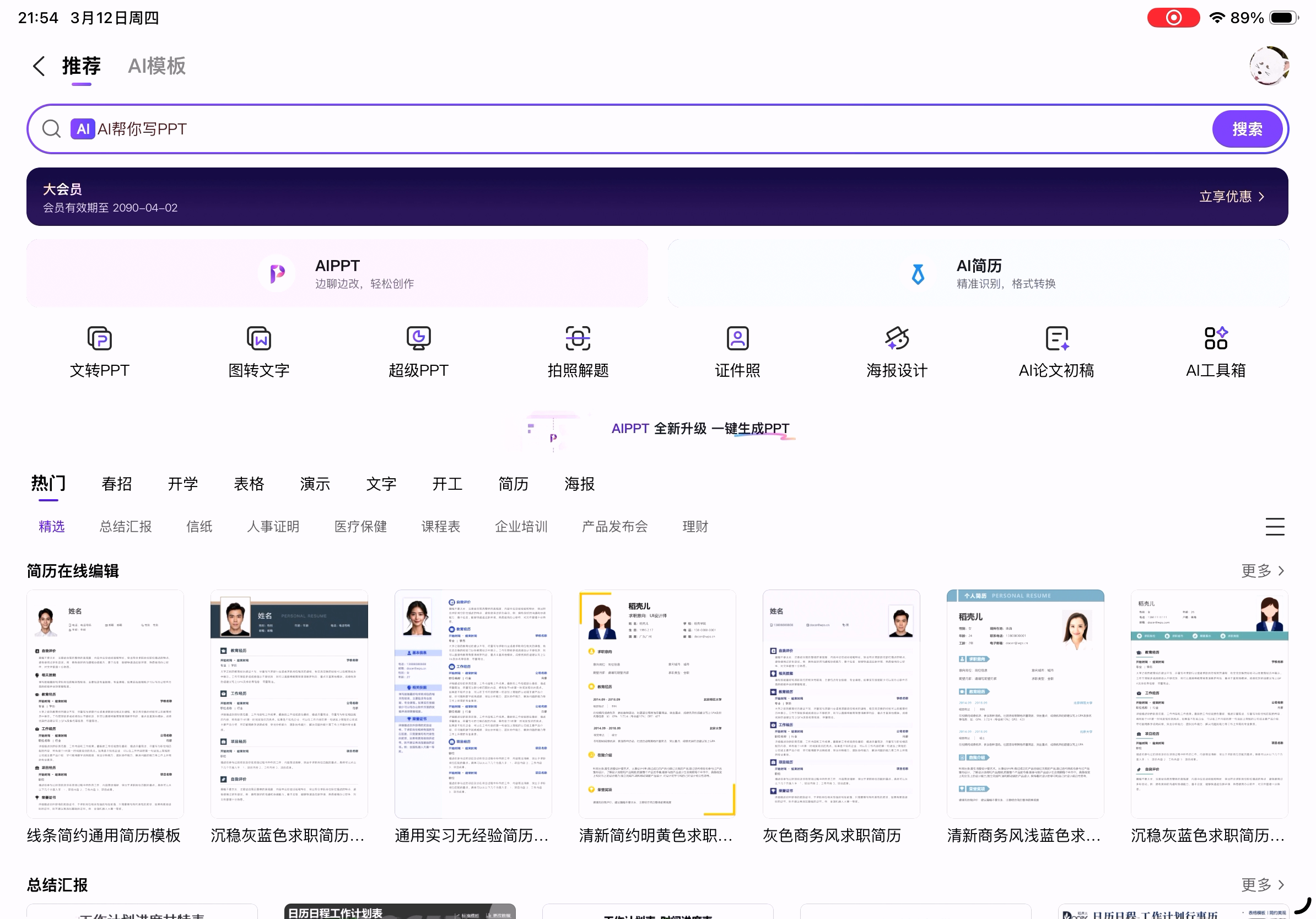 稻壳页面,Windows版中还多一项“AI写简历”,这里没有。我一直以为这里就是打开了一个前端页面,现在看来还不完全一样。