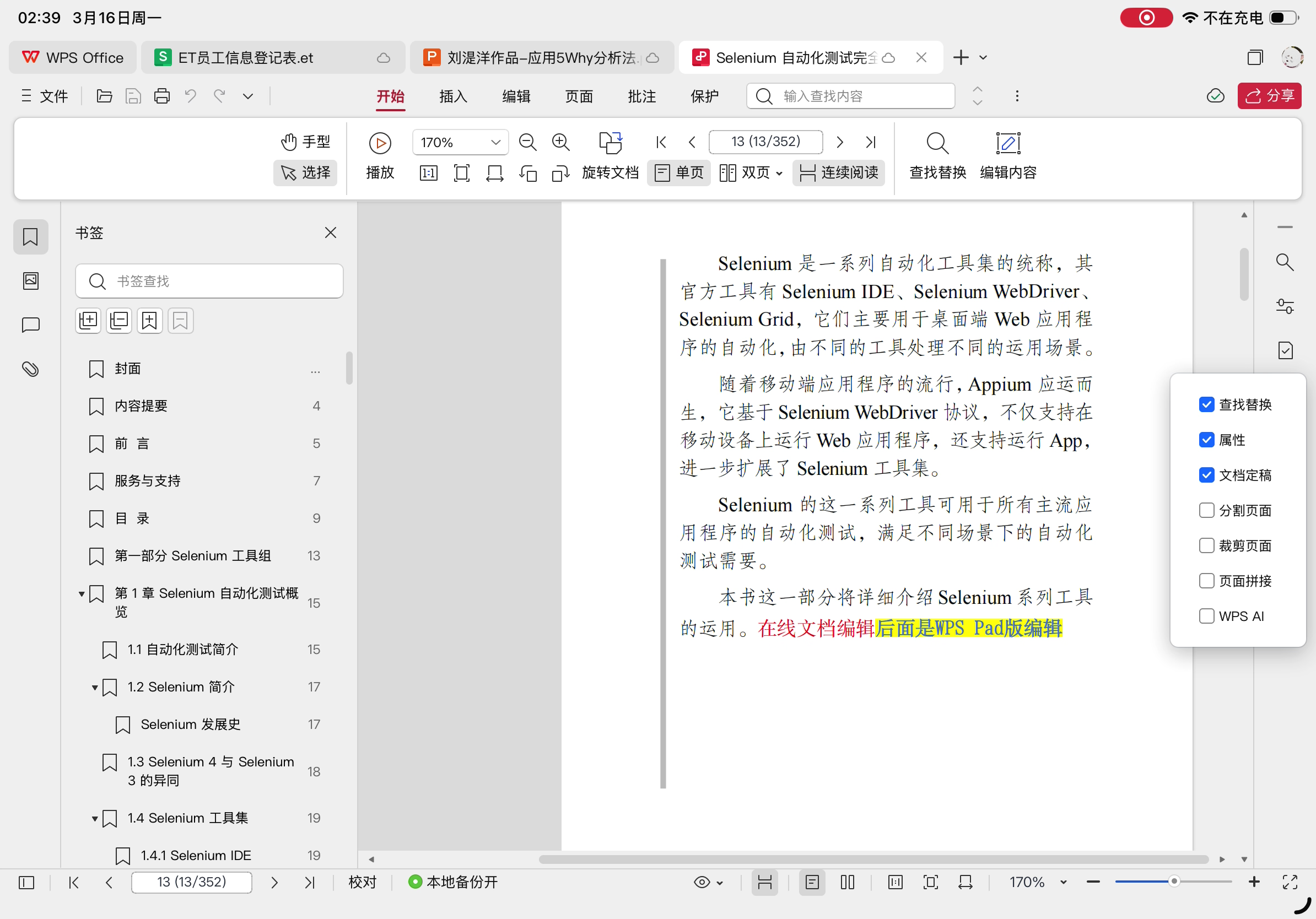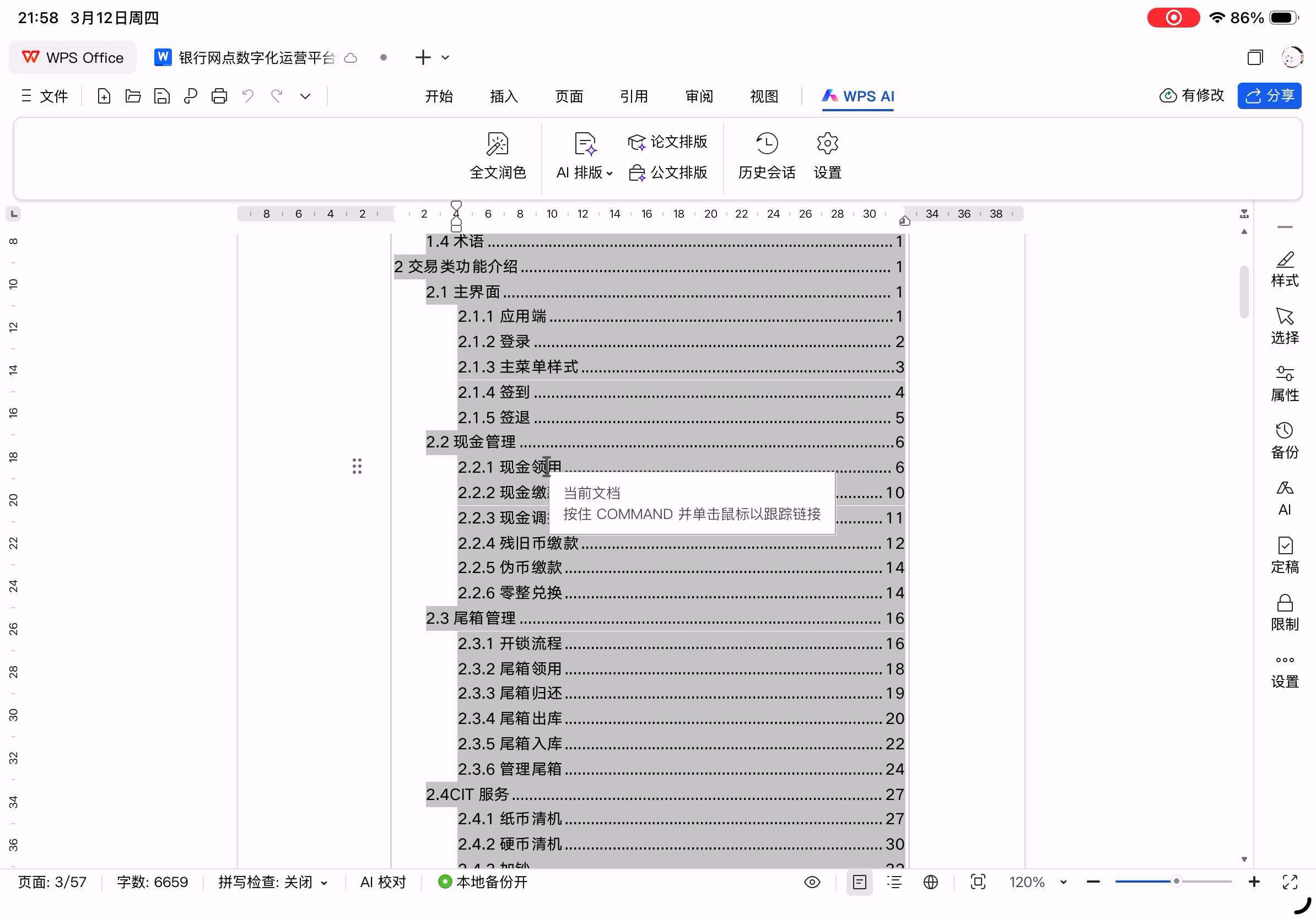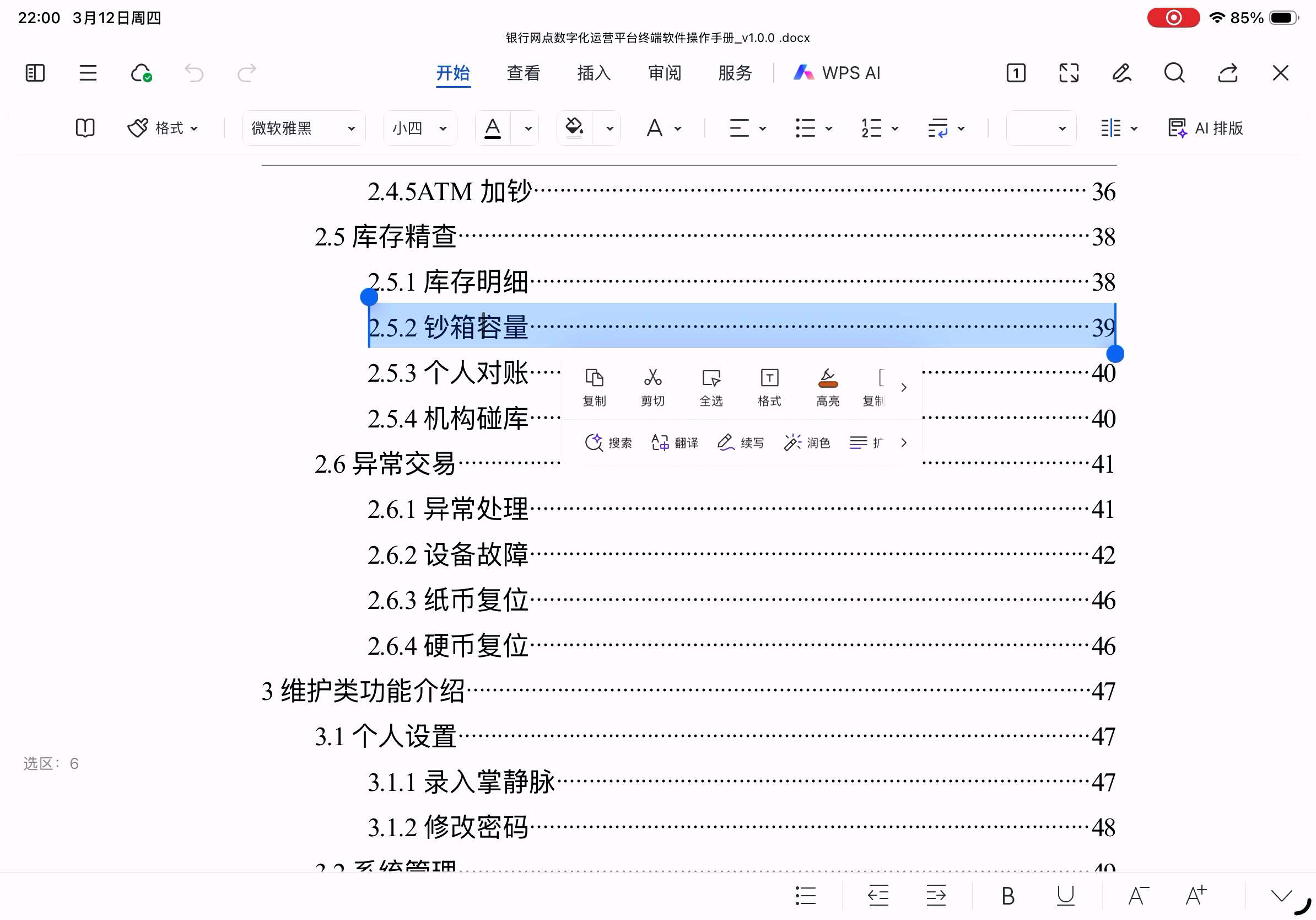 移动版点目录不能自动跳转。选中文字后菜单中出现了AI续写、润色、扩写等功能。