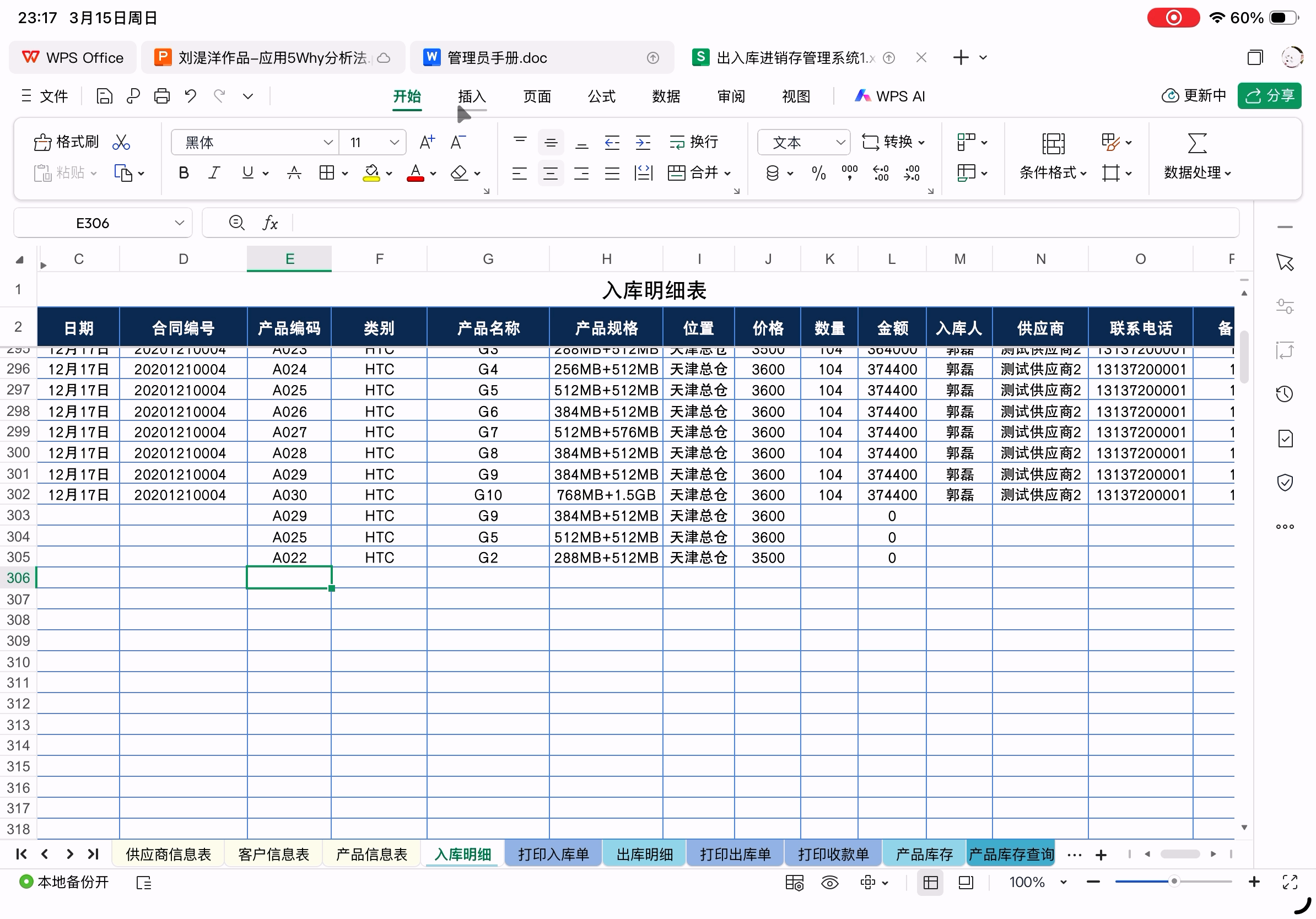 PC版WPS上查看,表格下面的几行空行也是之前在Pad上添加的。