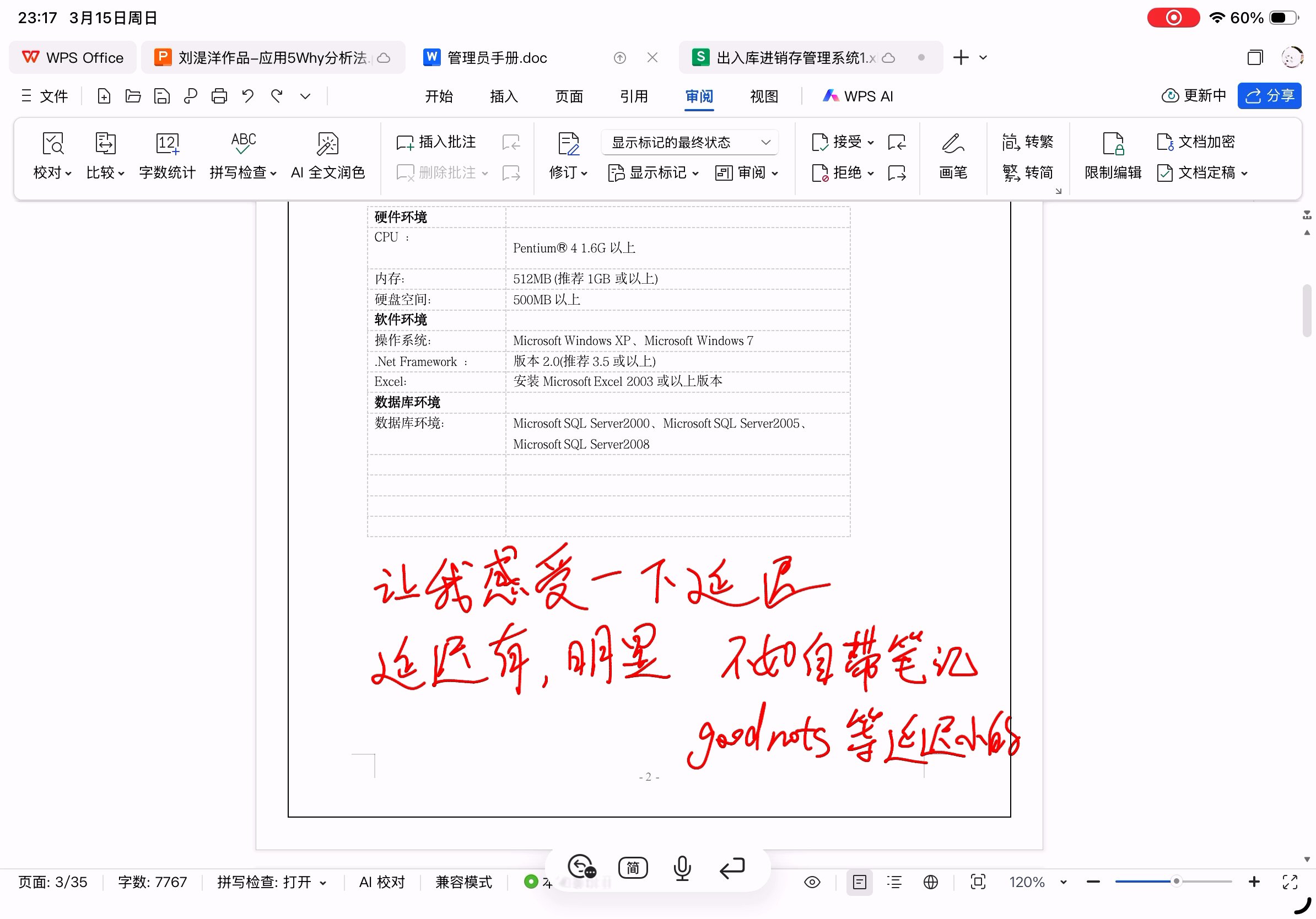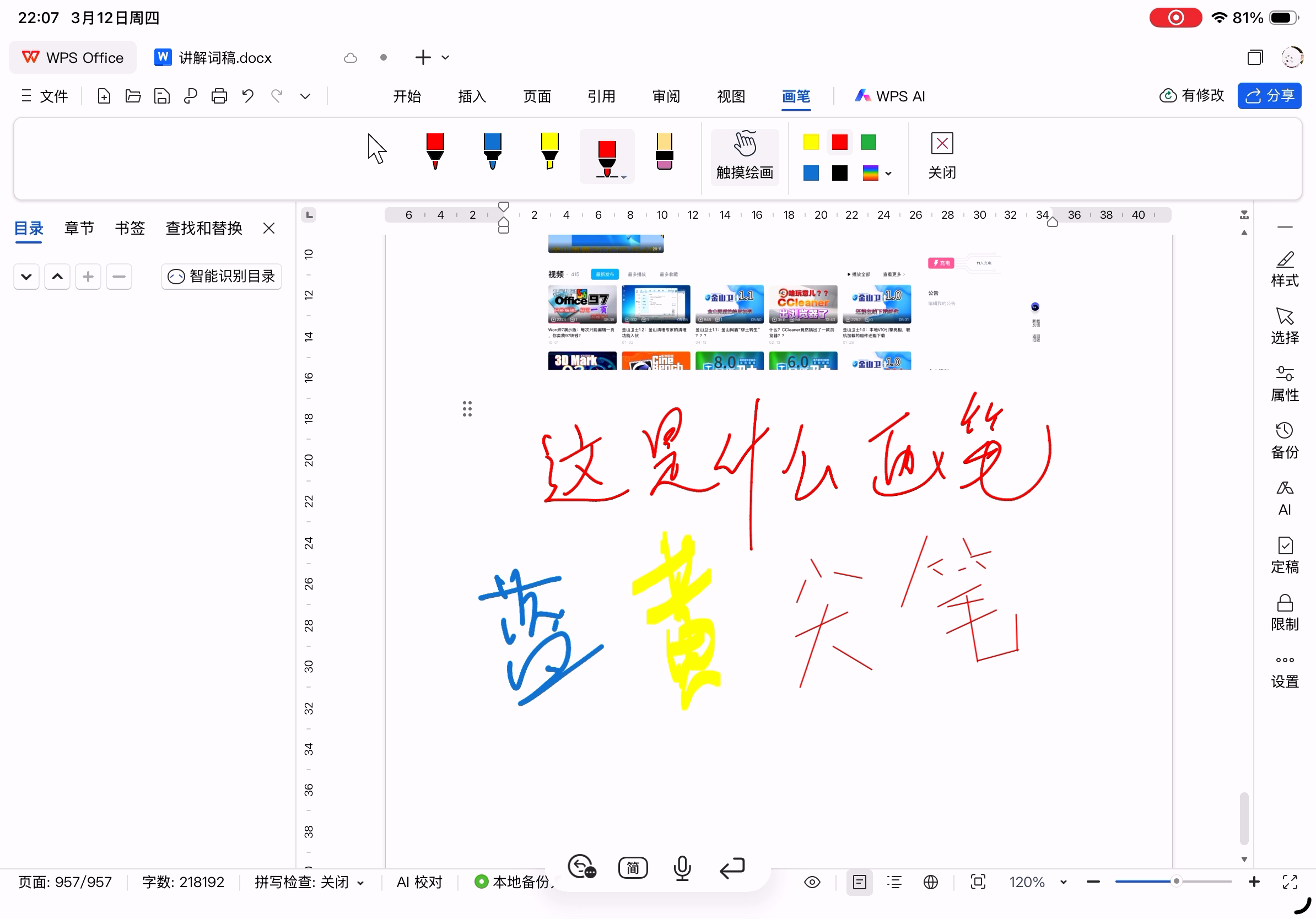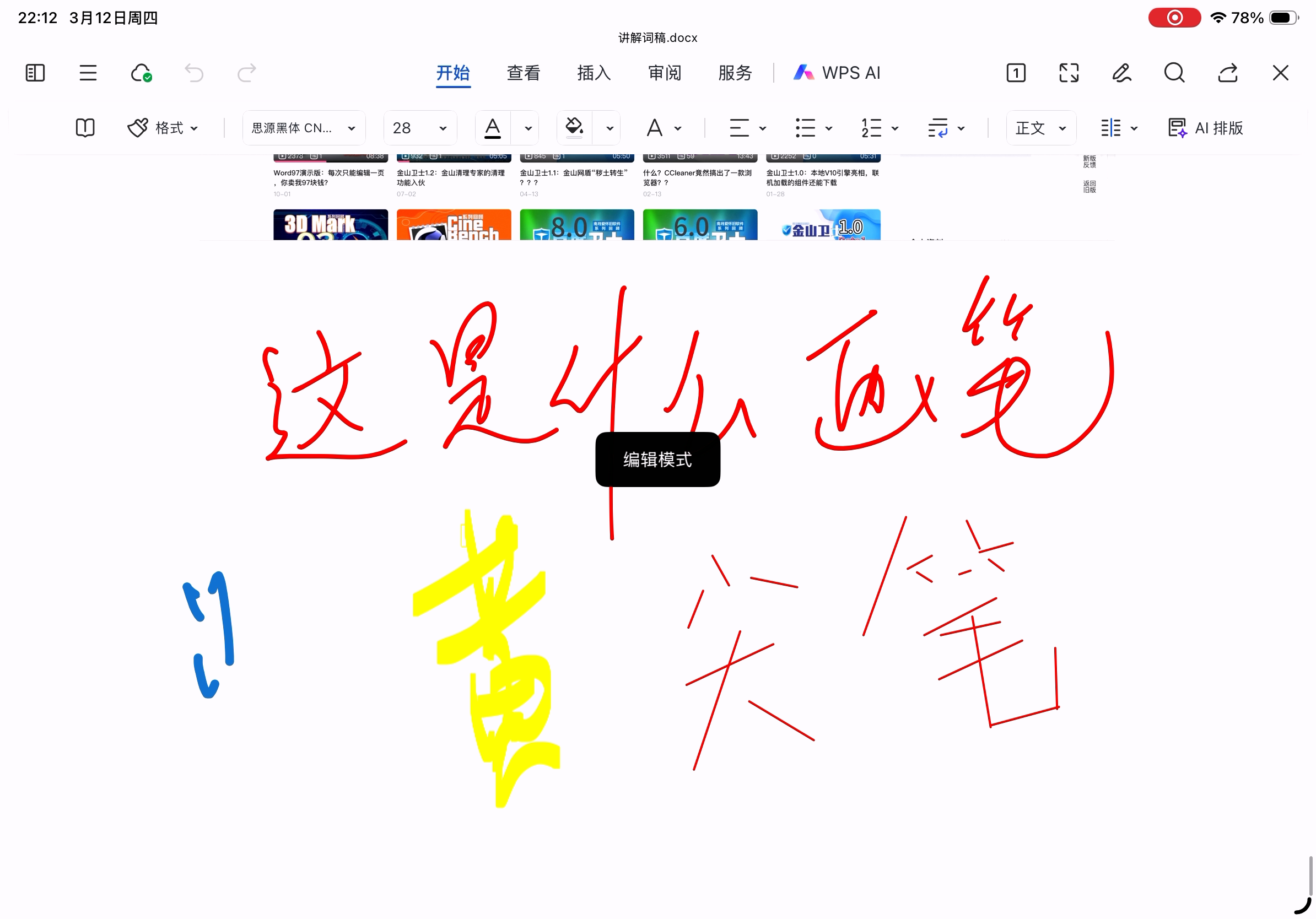 2.WPS文字的手写笔迹延迟很高(至少0.2s),无法发挥Apple Pencil的作用(作为对比GoodNotes几乎无法感知延迟),但PDF手写的延迟又很低