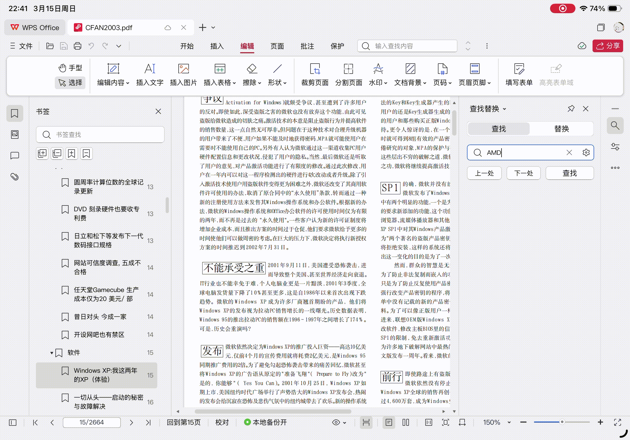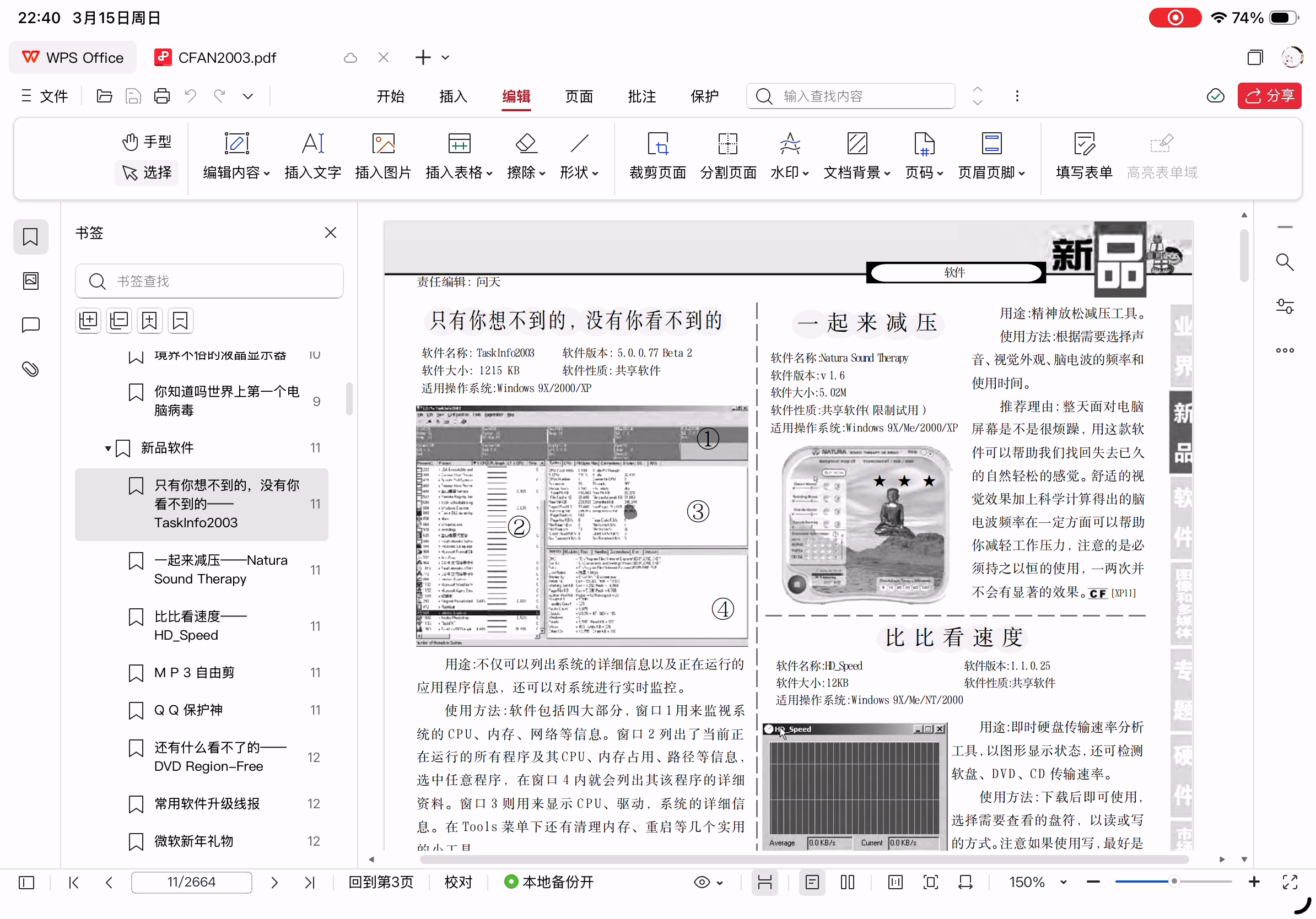 同样打开2664页的《电脑爱好者》2003年电子版,打开速度比之前的大Word文件快。