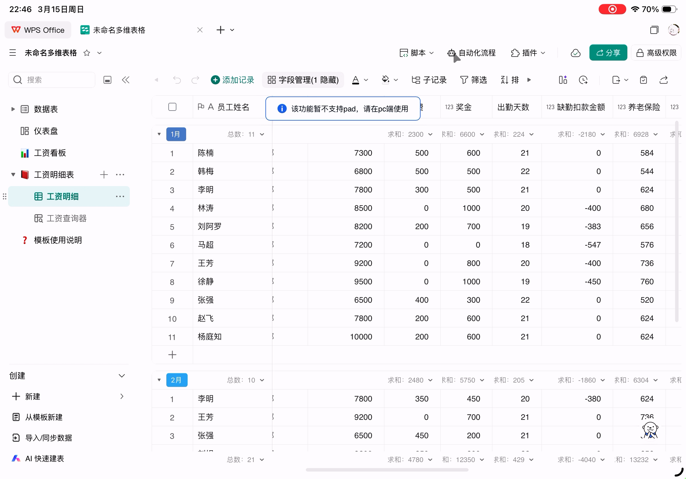 上面演示WPS表格时添加的数据,在PC版WPS上查看统计数据没问题。