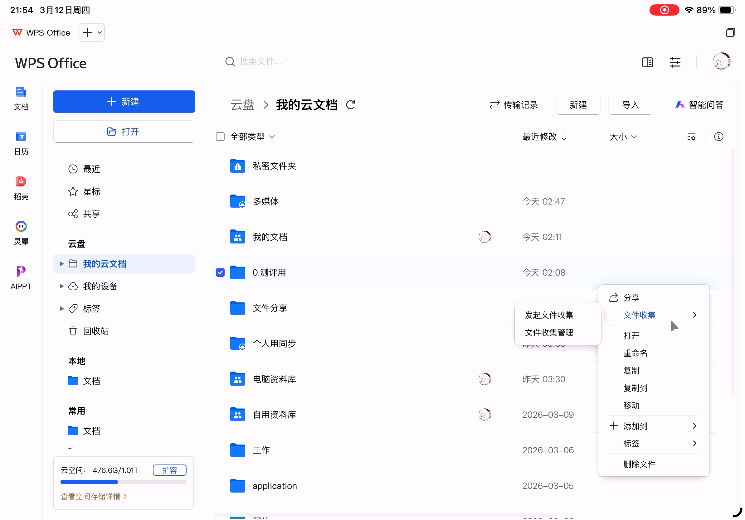 云盘文件菜单,一切都和PC版保持一致,除了没有标出知识库的紫色文件夹图标(当然也和当前版本不支持知识库功能有关)。