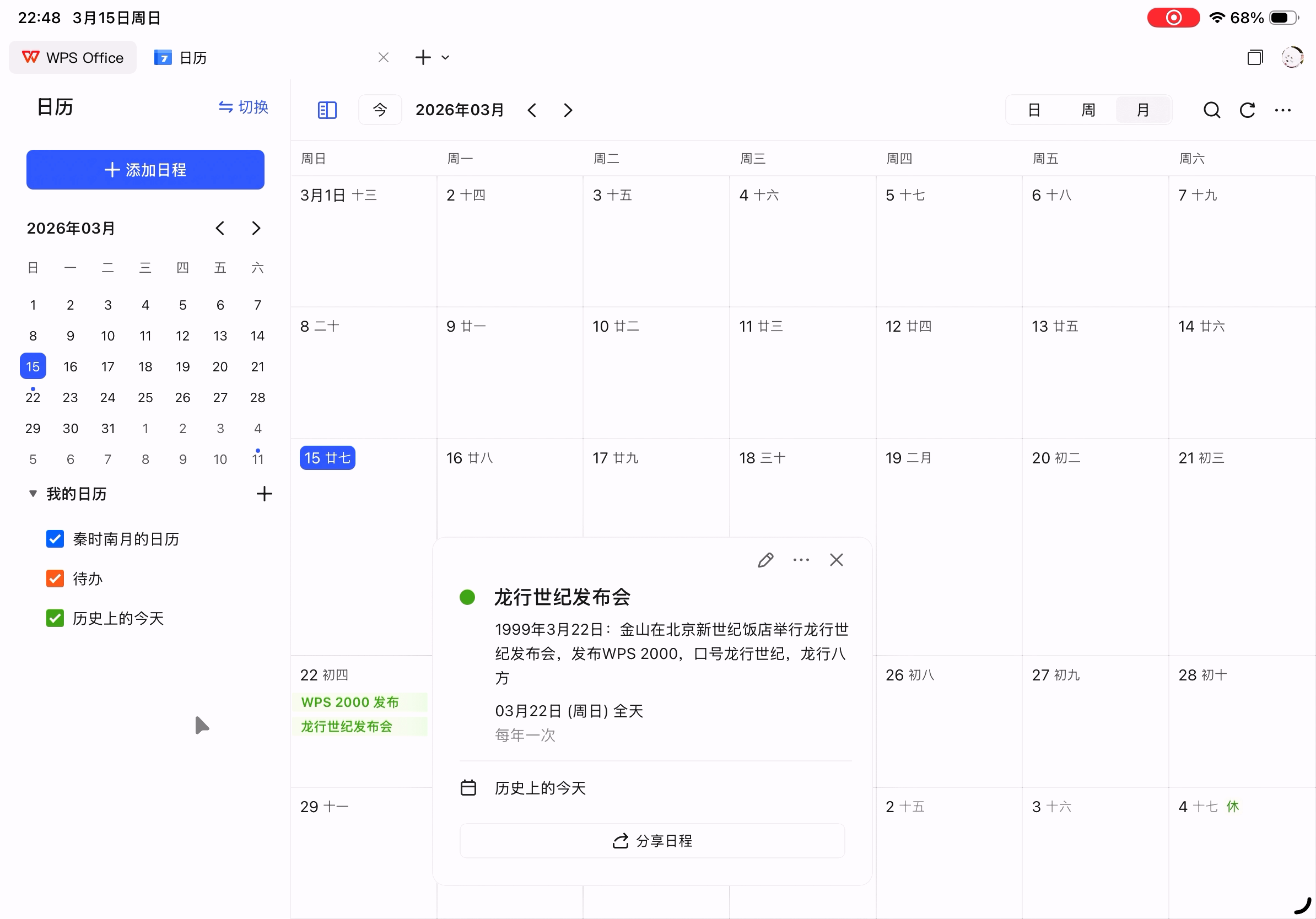 日历功能,可以正常读写保存在云端的日程。