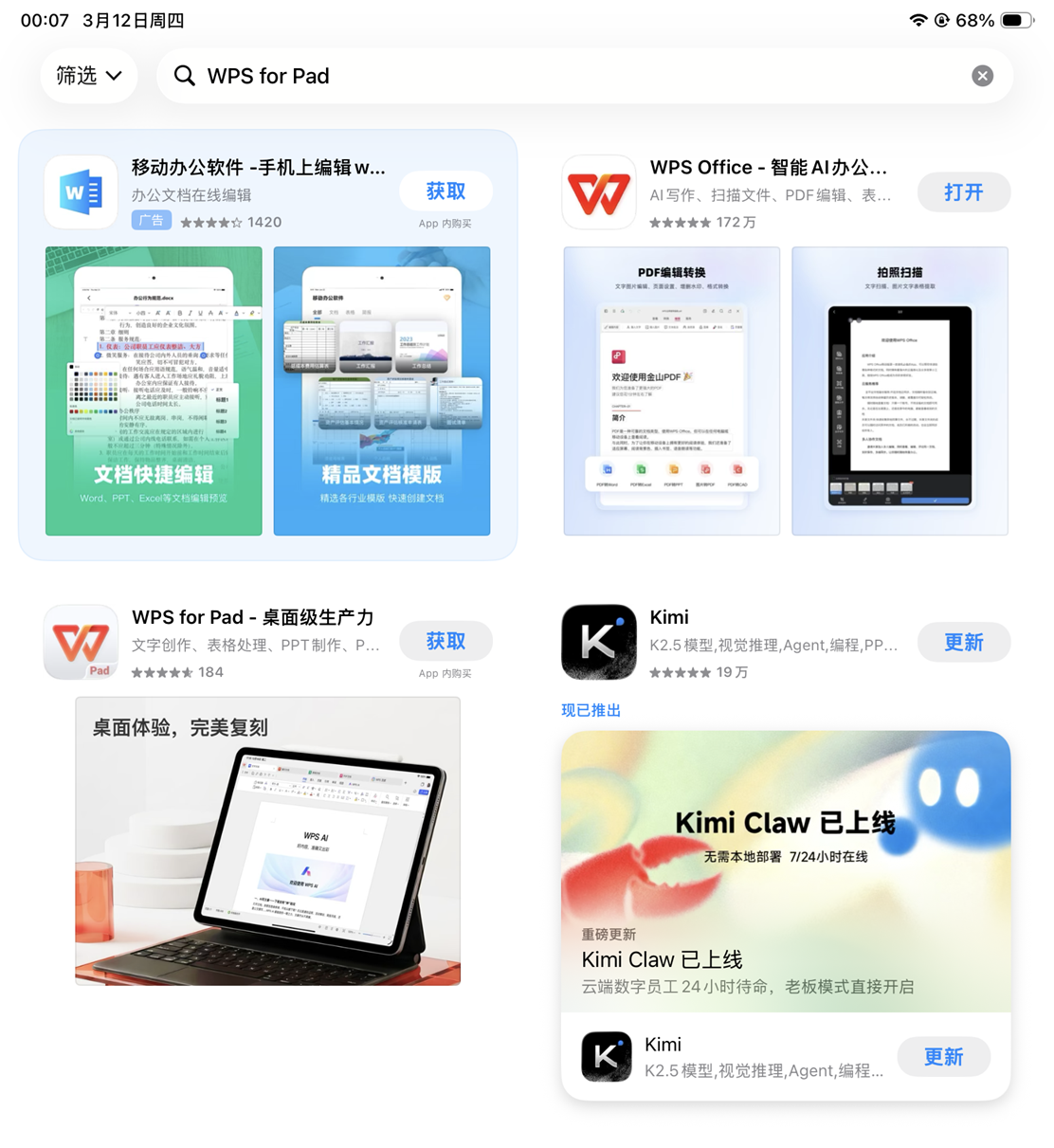 首先不要输入错名字:WPS for Pad,不是 iPad。而且搜到之后还不在第一个。