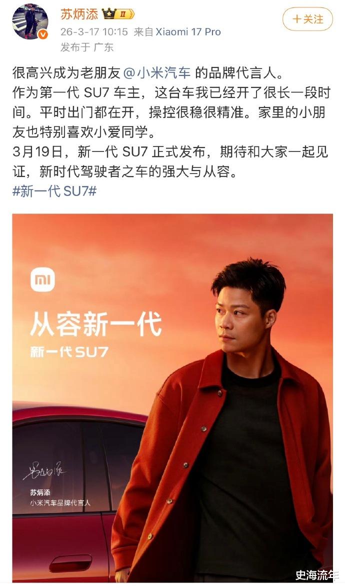 3月17日,雷军一句“因为他是亚洲跑得最快的人,因为他是第一代 SU7 车主,因为他姓 SU”,幽默回应了小米汽车启用苏炳添为代言人的原因。