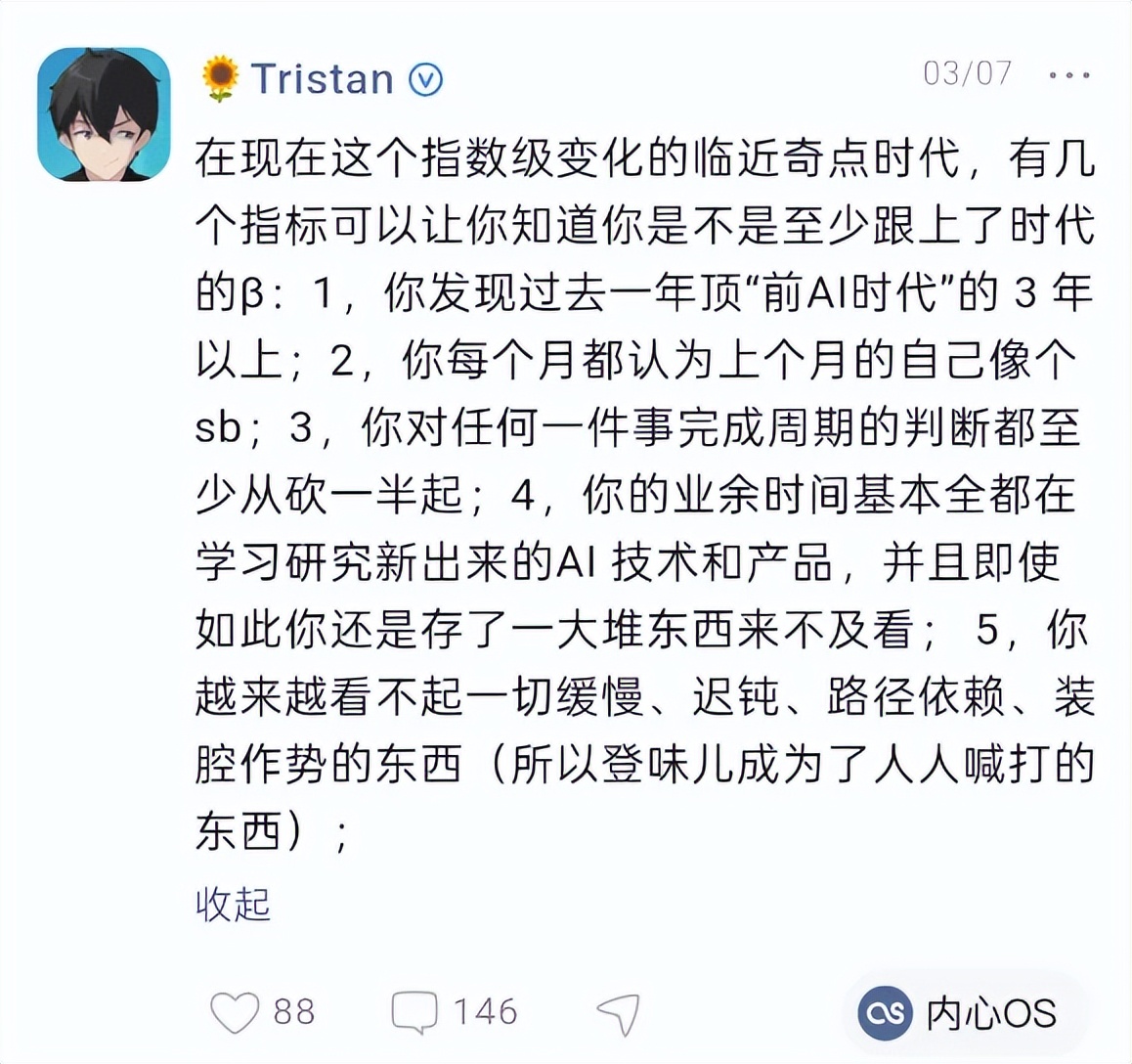 Tristan:我最近有一个越来越强的认知,好像以前没正式说过:我觉得 AI 时代最重要的一件事就是:「做自己」。