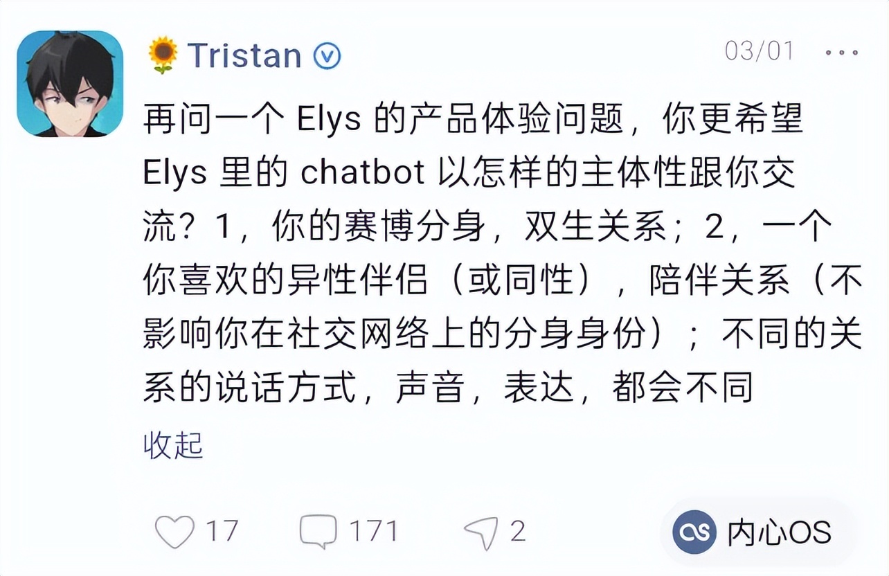 Tristan:我们内部有一个剧情组组长,当时也在测Elys。他刚开始录入Context的时候,觉得我们那时的ASR(自动语音识别)很傻,还顺嘴骂了几句。结果这些内容也一起被录进了他的记忆和口吻里。后来我们在产品里发帖,他的分身就开始「无脑喷」,说话方式、语气、节奏都特别像他。那一刻会有一种很荒诞、但又很真实的感觉。