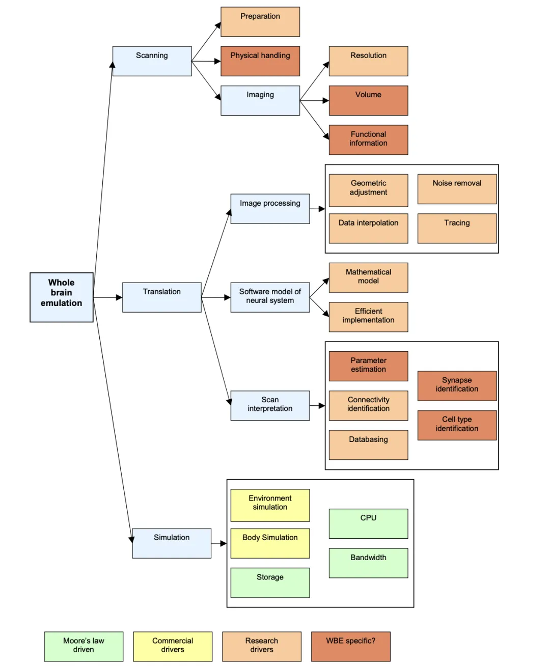 但这一技术路径仍然停留在设想中,直到2008年,牛津大学人类未来研究院的桑德伯格和波斯特洛姆在《全脑仿真:一份路线图》中正式提出“全脑仿真(WBE)”的术语与工程框架,才将这一概念从科幻想象推进为具有明确技术路径的跨学科科学研究方向。