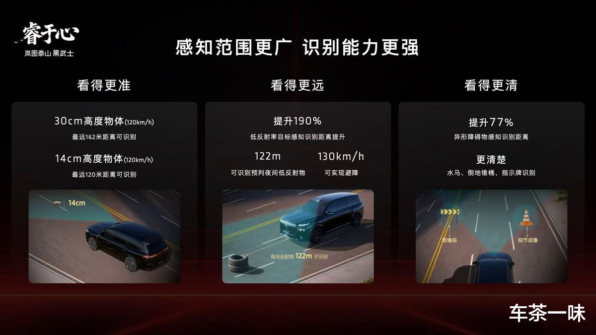 感知硬件是实现L3有条件自动驾驶的基础,岚图与华为优势互补,在高阶智驾系统与高精度感知硬件等方面展开深度合作,华为顶尖技术+岚图全维实力兜底,构筑价值壁垒,真正实现从“特定路况”到“全场景”通用,带来全天候的安稳与从容。岚图泰山Ultra版搭载行业最强四激光雷达矩阵,包含1颗行业量产最高规格的896线双光路图像级激光雷达,相比传统192线激光雷达,896线双光路图像级激光雷达实现了断层领先,针对30cm高度障碍物最远识别距离高达162米,针对14cm小目标也能实现120米远距识别,真正实现了从“点云级”到“图像级”的跨越,是目前行业感知硬件的“天花板”。除四激光雷达外,岚图泰山Ultra版还配备丰富的融合感知传感器,包括高清摄像头、毫米波雷达、超声波雷达等共计34颗智慧传感器。多传感器融合的感知体系,帮助岚图泰山Ultra版搭建起全场景无死角的感知网络。