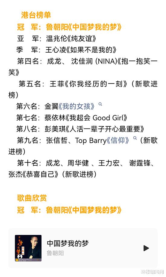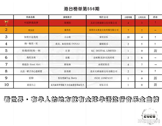 2026年3月9日,全球华语流行音乐金曲榜第556期榜单揭晓,中国内地知名音乐人鲁朝阳的经典主旋律歌曲《中国梦我的梦》再次登顶冠军宝座。这是该作品自2017年发行以来十余次斩获金曲榜周冠军,也是鲁朝阳个人音乐生涯中第60次在该榜单夺冠,再次刷新华语乐坛主旋律歌曲的纪录。