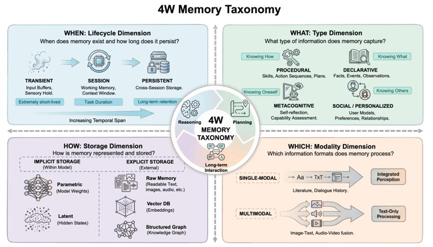 研究团队结合认知心理学、神经科学及记忆系统的经典理论,提出了一套清晰的 AI 记忆分类方法(4W 分类体系),并系统梳理了当前 AI 记忆的技术架构、应用场景和评估基准。