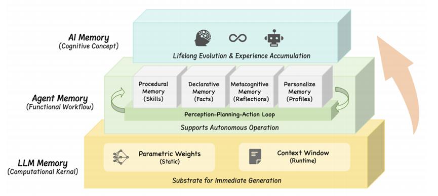 ·AI Memory:是一种更宏观的认知概念,旨在实现终身进化、长期持久性和适应性,它是面向终身学习、自进化的更高抽象。