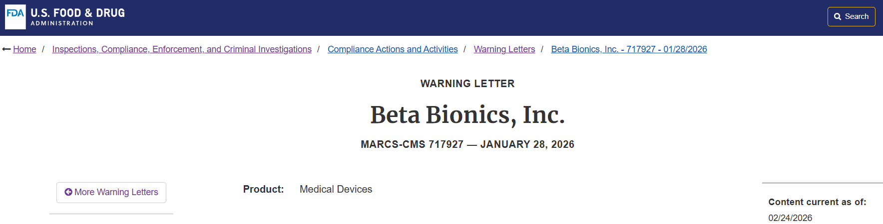 美国FDA药监局对Beta Bionics, Inc.公司生产现场检查认定该企业生产的iLet剂量决策软件和iLet ACE泵(均为iLet仿生胰腺系统组成部分)存在“掺假”违规问题,其生产方法、设施或控制措施不符合《联邦法规》21编第820部分的质量体系规范。FDA就此公布警告信,并于信件中直指多项违规行为(包括但不限于):