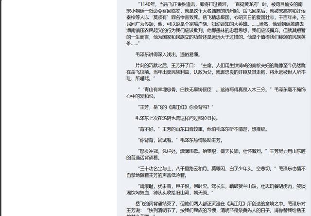 王芳在聆听的同时,提及了秦桧夫妇的雕像依旧跪在岳飞墓前的情况。随后,毛主席话题一转,问王芳能否背诵《满江红》。王芳来自山东新泰,口音较为浓重。尽管如此,她依然准确无误地全文背诵了出来。