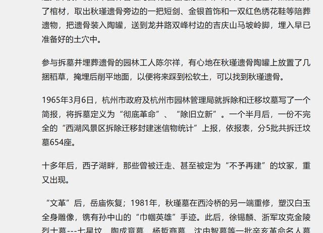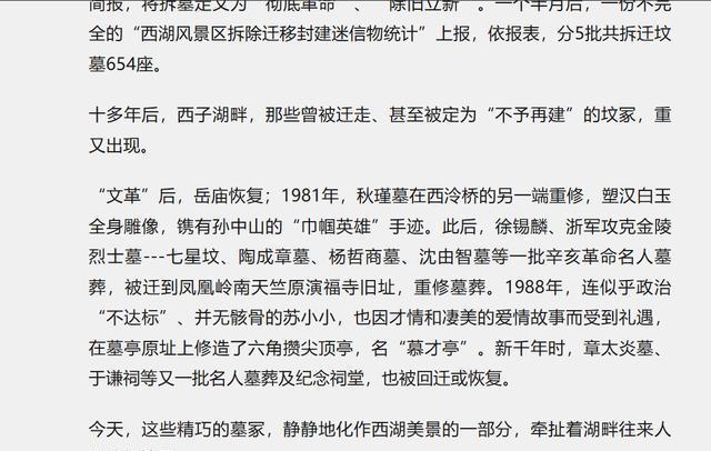 然而,需要明确的是,无论是初期的迁墓行为,还是后续的修复工作,均不能简单地视为有误。这是因为,无论是毛主席的决定,还是后来杭州相关部门的行动,都是基于维护人民实际利益的考量。只不过,随着时间的推移,人们的观念和看法发生了转变。