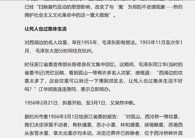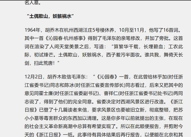 1964年,浙江省委作出了对西湖风景区进行更新的决定,旨在展现全新的风貌。西湖周边尚存的某些名人坟墓,被视为影响群众观瞻的不利因素。毛泽东主席在了解这一情况后,给予了坚决的支持。