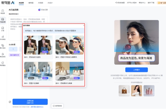 易可图是一款集成多种图像编辑功能的在线修图工具,特别是它的 AI 万能改图功能覆盖了常见的修图需求。用户可以通过简单的文字描述,完成局部修改、换背景、去水印、商品换色、细节修复等操作。对于电商卖家来说,它还能根据指令自动优化商品图细节,提升整体视觉表现。
